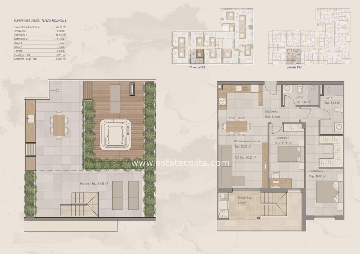 NEW BUILD PENTHOUSES IN TORRE-PACHECO New Build residential complex of apartments in Torre Pacheco (Murcia) in the heart of Costa Cálida. The second phase has 25 apartments and penthouses with 2 and 3 bedrooms. Modern apartments with open plan kitchen with spacious and bright living-dining room with access to a large terrace. Modern penthouses has private solarium. An options underground parking space and storage room at an extra cost. Modern complex with communal swimming pool and garden areas. All the comforts are at your fingertips. There are supermarkets, pharmacies, banks, schools, bars, restaurants, the beach and the airport are just a few minutes away. There is also a golf club in town very close to the apartments and there are several golf courses within a 10-25 minute drive from the apartments. The AP-7 highway is also close by and the N-332 is also very easy to access, so you can easily travel to other regions such as Pilar de la Horadada, San Pedro del Pinatar, Orihuela Costa, Torrevieja, Alicante, etc. The Murcia Corvera international airport is 20 minutes away, Alicante airport about an hour away.