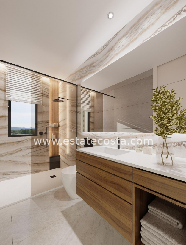 NEW BUILD VILLAS IN PRIVATE GATED RESORT IN PROVINCE OF MURCIA New Build villas in private gated resort in the Murcia region, surrounded by excellent golf courses and just 10 minutes from the sandy beaches of the Mar Menor Sea. Villas build over of 3 floors and has 3 bedrooms, 3 bathrooms, open plan kitchen and living-dining room, fitted wardrobes, basement, private garden with the pool and parking space. Located in a private gated resort, with a main access entrance and 24 hours security. The resort is designed around an impressive 126.000 m2 green area. It comprises walking and cycling paths, sport facilities, paddle and tennis courts, a mini-golf course, gardens, dog parks, leisure areas, clubhouse…. Also in the central area is the jewel of the resort, a crystal-clear artificial lake of almost 17.000m2 of water surface, surrounded by white sandy beaches and palm trees, bringing a piece of the Caribbean to the Murcia Region. There are 2 islands in the lake, one of them has its own bar, there are also “beach Chiringuitos” spread around the lake. The resort is strategically located less than 4 km from the beach and the town of Los Alcázares, where you can practice various water sports, surrounded by several golf courses and the city of Cartagena less than 15 minutes by car and 22 km from Murcia airport, therefore having a wide cultural, gastronomic and sports offer within reach.