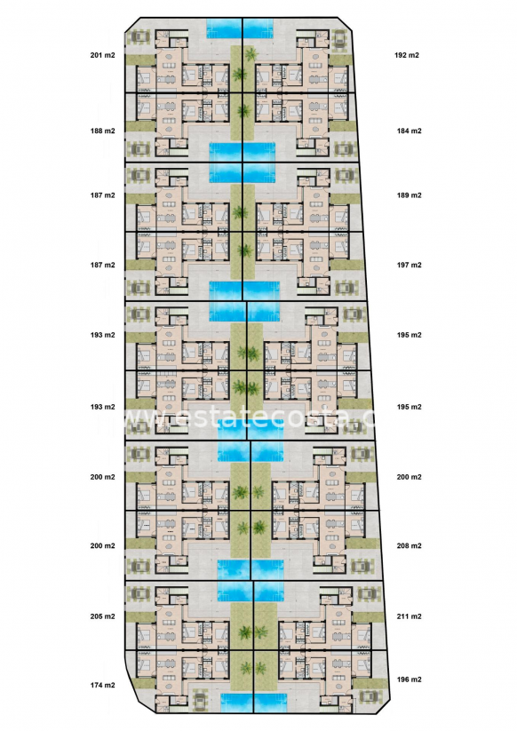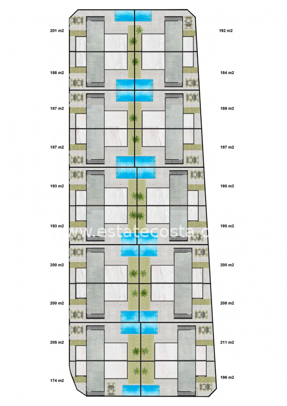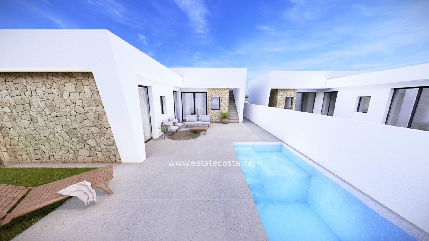 NEW BUILD SEMI-DETACHED VILLAS IN ROLDAN New Build 3 bedroom villas with parking to the front, feature stone walling, rear private swimming pool, large roof solarium and a storage room in Roldan, Torre-Pacheco. The villas are designed on one level with elevated ceiling to the kitchen area, each villa boasts wrap around terrace / sun zones on the ground floor and a large private solarium on the first floor to enjoy hours of sunshine, all year round. 3 bedrooms (master bedroom en-suite) and separate family bathroom… designed with a contemporary ‘eco’ style and open plan concept, comprising a fitted kitchen and lounge-dining room, a storage room to the front and a private summer patio area. The villas are equipped with a rear private swimming pool with outdoor shower, solarium, terrace areas, fully fitted kitchen and bathrooms with led mirror, lined wardrobes with drawers, interior/exterior lighting, pre installed air-conditioning. Feature angled walls and stone cladding to the front and stairwell, really makes this villa pop with style. The development is located in a residential area of Roldan, surrounded by services, parks, sports facilities, two Golf Courses and only 12 minutes from the stunning beaches of the Mediterranean and the Mar Menor. A select signature style development – just 20 one level contemporary villas – All enjoying generous plot sizes, with private swimming pool and roof solarium. Roldan itself is a traditional town with all the local amenities you will need including Supermarkets, Restaurants, Bars, Health Clinic, Pharmacy, Police Station, Petrol Station, Mechanics, Dentists, Doctors and more. The nearby golf resorts of La Torre, & Terrazas are easily accessible, Corvera Airport is 15 minutes away & the beaches of the Mar Menor just 20 minutes drive.