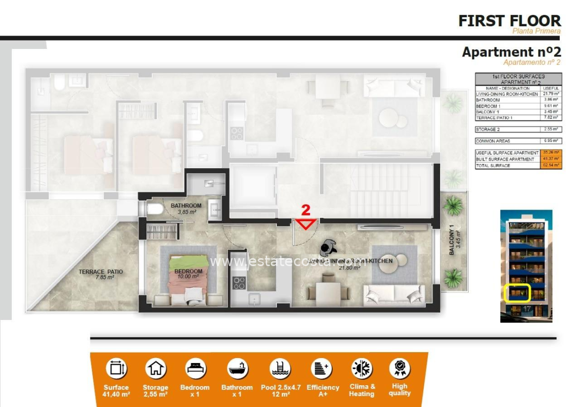 New Build Apartments 200 Metres from the Sea in Torrevieja Modern Homes in a Prime Location Discover this new development in the heart of Torrevieja, just 200 metres from Acequión Beach, one of the most popular beaches in the city. This residential building has 11 homes distributed in a quiet environment, ideal for those looking to live near the sea without giving up urban amenities. The location offers walking distance to the centre of Torrevieja, parks, restaurants, supermarkets and all the services you need for everyday life. Distances to key points: Acequión Beach: 0.2 km Torrevieja town centre: 0.7 km Marina Salinas marina: 1.5 km Torrevieja University Hospital: 5.5 km Villamartín golf course: 10 km Habaneras Shopping Centre: 3 km Alicante Airport: 45 km Different Types to Suit All Needs The building offers a selection of studios, 1 and 2 bedroom apartments, and penthouses with large private terraces. All homes have a storage room included on the ground floor and access to modern communal facilities that enhance the level of comfort and lifestyle. Communal Areas for Wellbeing and Enjoyment The roof terrace of the building has been designed as a premium communal area with: Swimming pool Solarium Sauna Barbecue area Perfect for enjoying the Mediterranean climate of Torrevieja all year round. High-end finishes in every home The homes have been built with top-quality materials and contemporary design: PVC exterior carpentry with Guardian Sun double glazing Motorised blinds with thermal insulation Security entrance door with lock Kitchen equipped with wall and base units and integrated appliances: ceramic hob, oven, microwave, extractor fan and dishwasher Hot water produced by aerothermal system Fully installed air conditioning LED lighting Lift in the building Live a stone's throw from the sea and the town centre Torrevieja is one of the most dynamic and growing coastal towns on the Costa Blanca, famous for its climate, beaches, salt flats and cultural life. This development is ideal as a permanent residence, investment or second home for holidays. Contact us today for more information or to arrange a viewing and secure your home by the sea in Torrevieja.