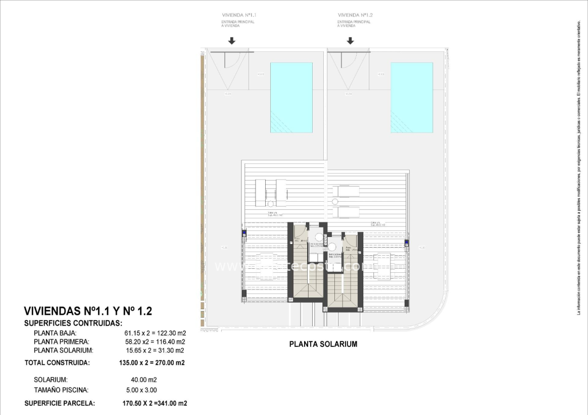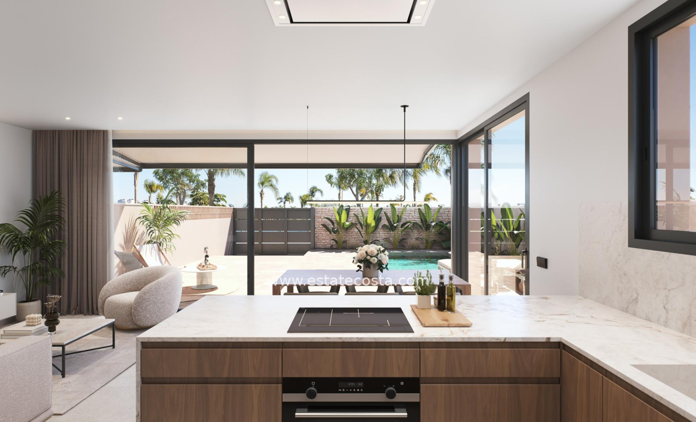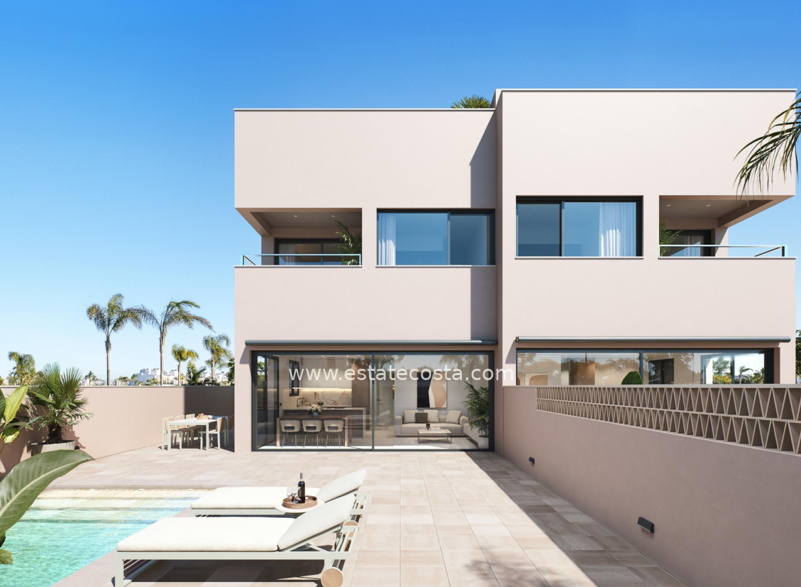 Exclusive residential development of 2 luxury semi-detached villas with sea views on Las Higuericas beach, Torre de la Horadada. Discover these impressive semi-detached homes located in Torre de la Horadada, on the second line of Las Higuericas beach. With a modern and elegant design, spacious rooms and top quality materials, these properties have been designed to offer maximum comfort and exclusivity. With a 5×3m private pool, parking on the plot and a 40 m2 solarium: a spectacular open space ideal for a chill-out area, barbecue or enjoying the sun and unobstructed views. Each villa has independent access from the surrounding streets, as there are no adjacent buildings. With quiet streets and large green areas around the residential complex, these properties are ideal for young families. The villas have a plot of 170 m2 and a built area of 135 m2. The villas are built with three bedrooms and three bathrooms (two of them en-suite) on two floors. The kitchen is fully fitted with the possibility of customisation and includes appliances. Following an open-plan concept, the dining room is surrounded by large windows, providing a pleasant source of natural light, with direct access to the pool and gardens finished with lighting, irrigation and local vegetation. The selected finishes, with top quality materials, the customised luxury design and maximum comfort, together with ducted air conditioning and heating included in all areas, make the villa enjoyable in the hot summers and also in the mild winters, making it possible to live here all year round. Located in one of the best areas of the Costa Blanca, these properties offer a peaceful environment, yet with all amenities nearby: restaurants, supermarkets, golf and shopping centres. The two semi-detached villas are located on the second line of the beach in Las Higuericas, in Torre de la Horadada, a paradise in every way, where you can enjoy the seafront, the immensity of the Mediterranean Sea, the promenade, refreshing swims in the sea, water sports, sailing, surfing, snorkelling and only 8 km from Lo Romero Golf, one of the 21 golf courses on the Costa Blanca. It is 5 minutes from the marina of La Torre de la Horadada and 10 minutes from the marinas of San Pedro del Pinatar, and the best restaurants where you can sample the finest Mediterranean cuisine. Not to mention the proximity of the AP7 motorway, which connects our residential area with two airports with international destinations, Corvera, 44 km away, and Altet, Alicante, 75 km away. The nearest town to the development is Pilar de la Horadada, 1 km away, a quiet village with all kinds of services, schools, health centres, police, pharmacies, etc. There are also two shopping areas nearby, the Dos Mares Shopping Centre in San Javier, 5 minutes away by car, and La Zenia Boulevard in Orihuela Costa, 15 minutes away by car.