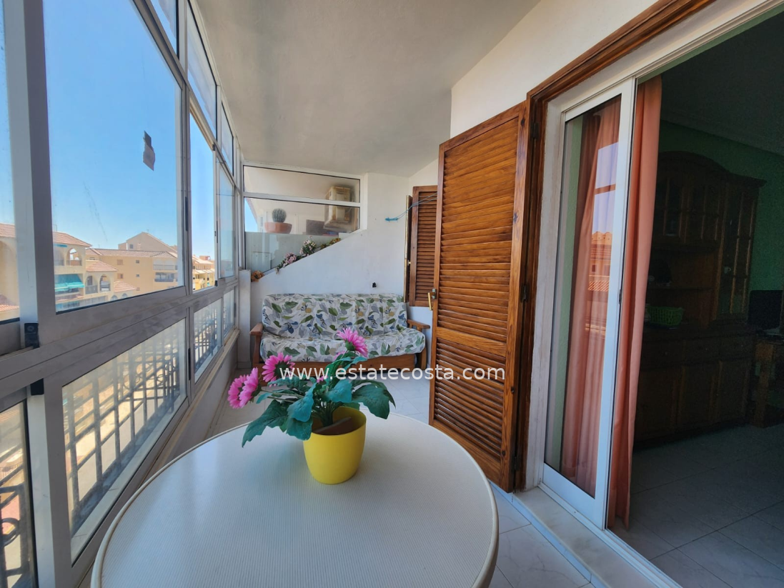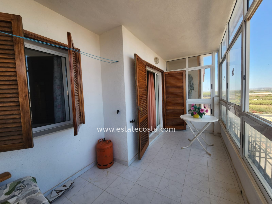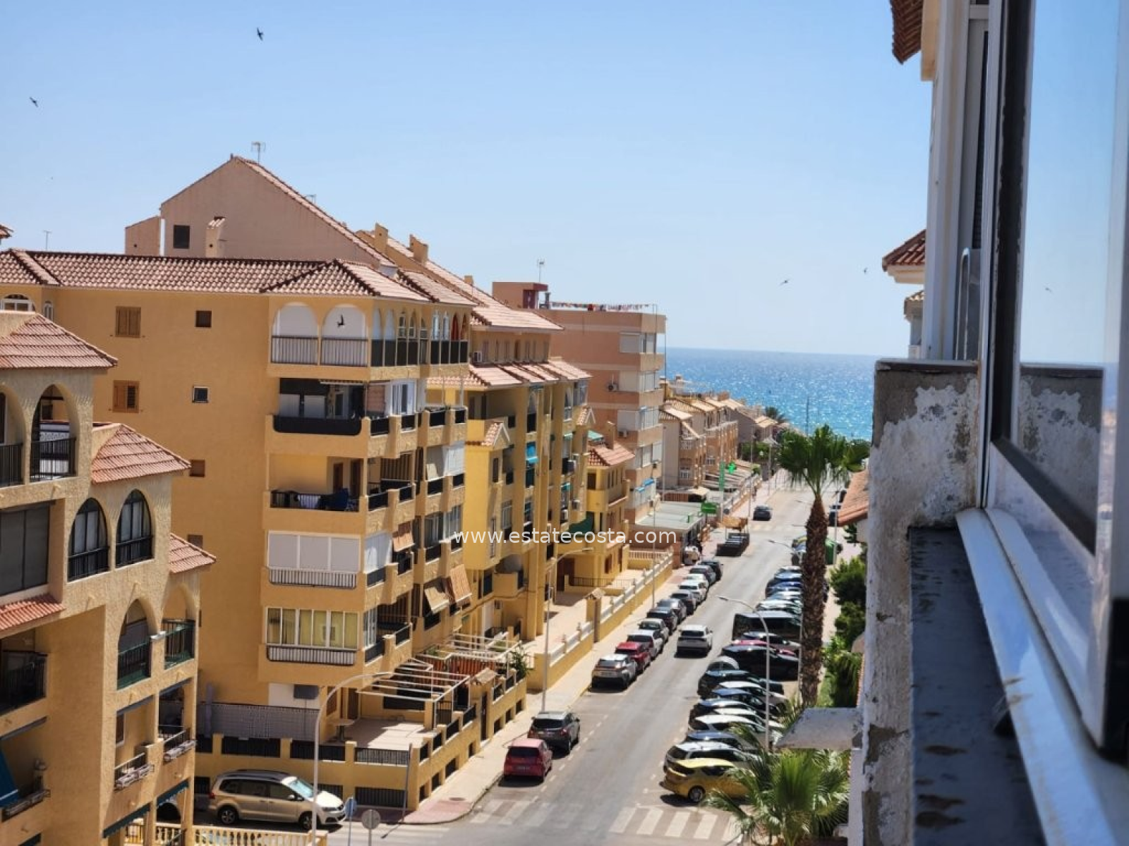 This home is located in the Viñamar 4 development, in La Mata.It is located on the 5th and top floor of the building. It faces north with side views of the sea and the lagoon.A constructed area of 45 m2 + a 6-meter terrace.It features a living-dining room, one bedroom, a full bathroom, an open-plan kitchen, and a large terrace.Communal pool300 meters from the beachIncludes a closed double garage for two cars.We've added five photos showing how the home could look with a small investment. This gives you a better view of the home and its potential.Communal fees: €380 per yearProperty tax: €160