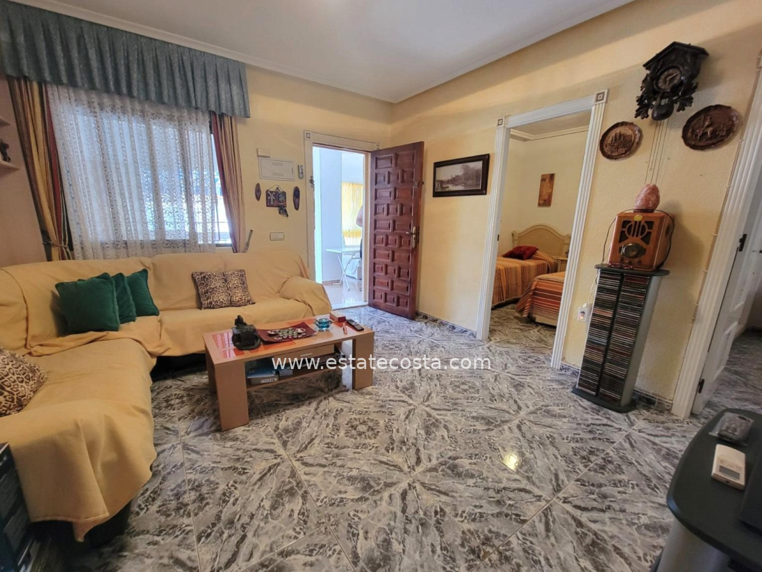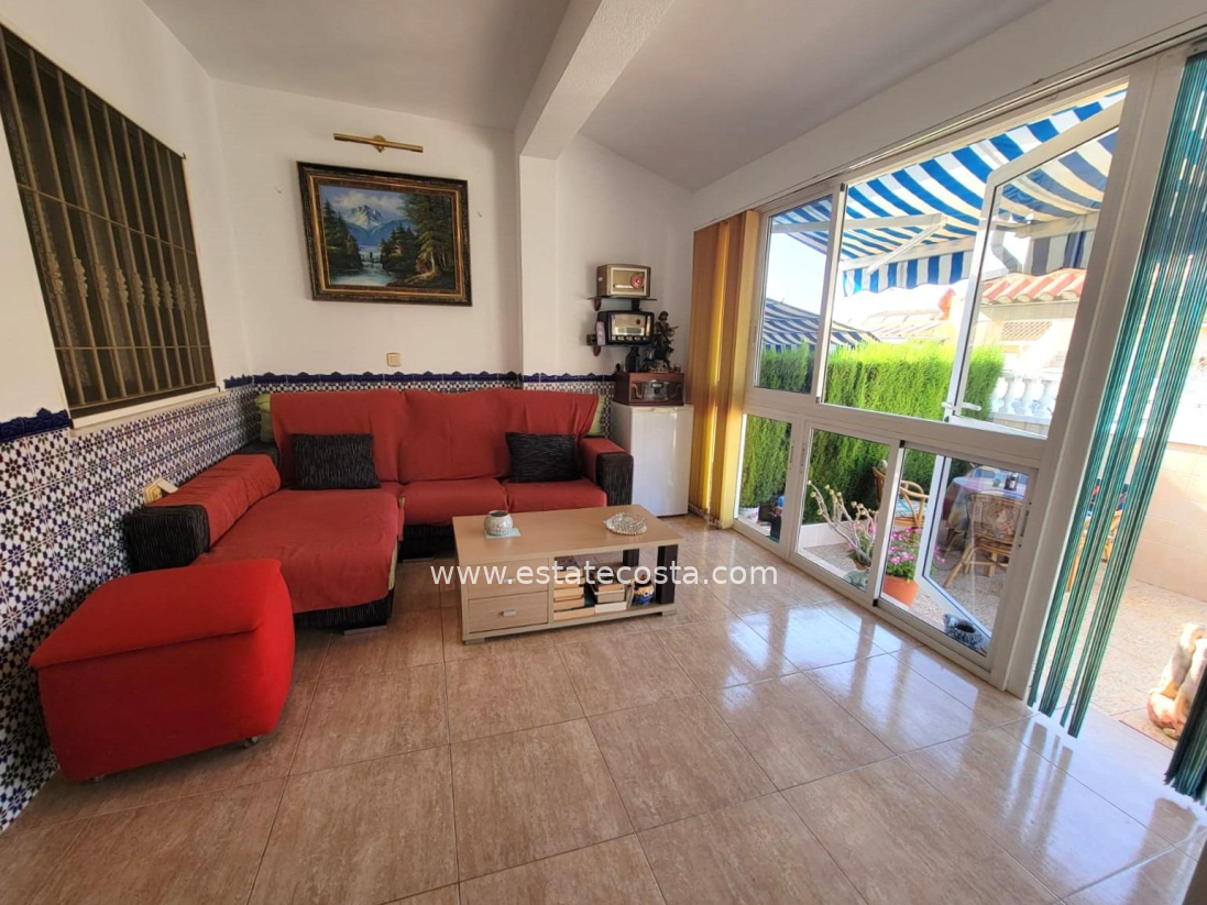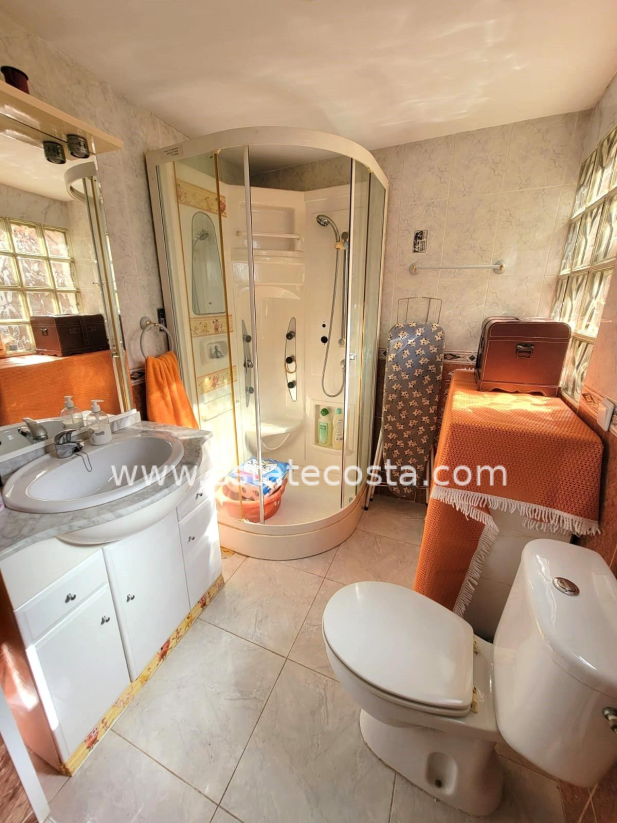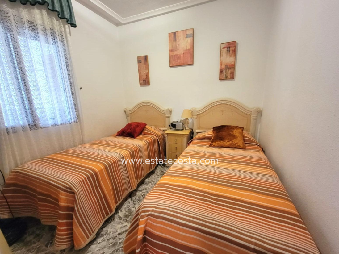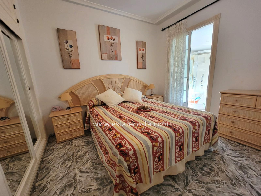 Lovely ground floor bungalow, in very good condition, South facing, with swimming pool in Los Frutales area. It consists of a large cozy front terrace, a glass-enclosed porch converted into a Summer living room, a living room, a fully equipped semi-open kitchen with access to a back patio, two double bedrooms (main bedroom with an en-suite bathroom), 2 bathrooms with showers and two storage rooms. Furnished. Air conditioning. You can park your vehicle in front of the property. All located in a nice and closed Residential with swimming pool and gardens, about a 20-minute walk from the beach "Los Locos" and "Torre del Moro" park. With all services, restaurants, cafes, supermarkets, bus stops, etc., nearby.