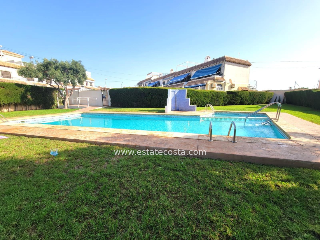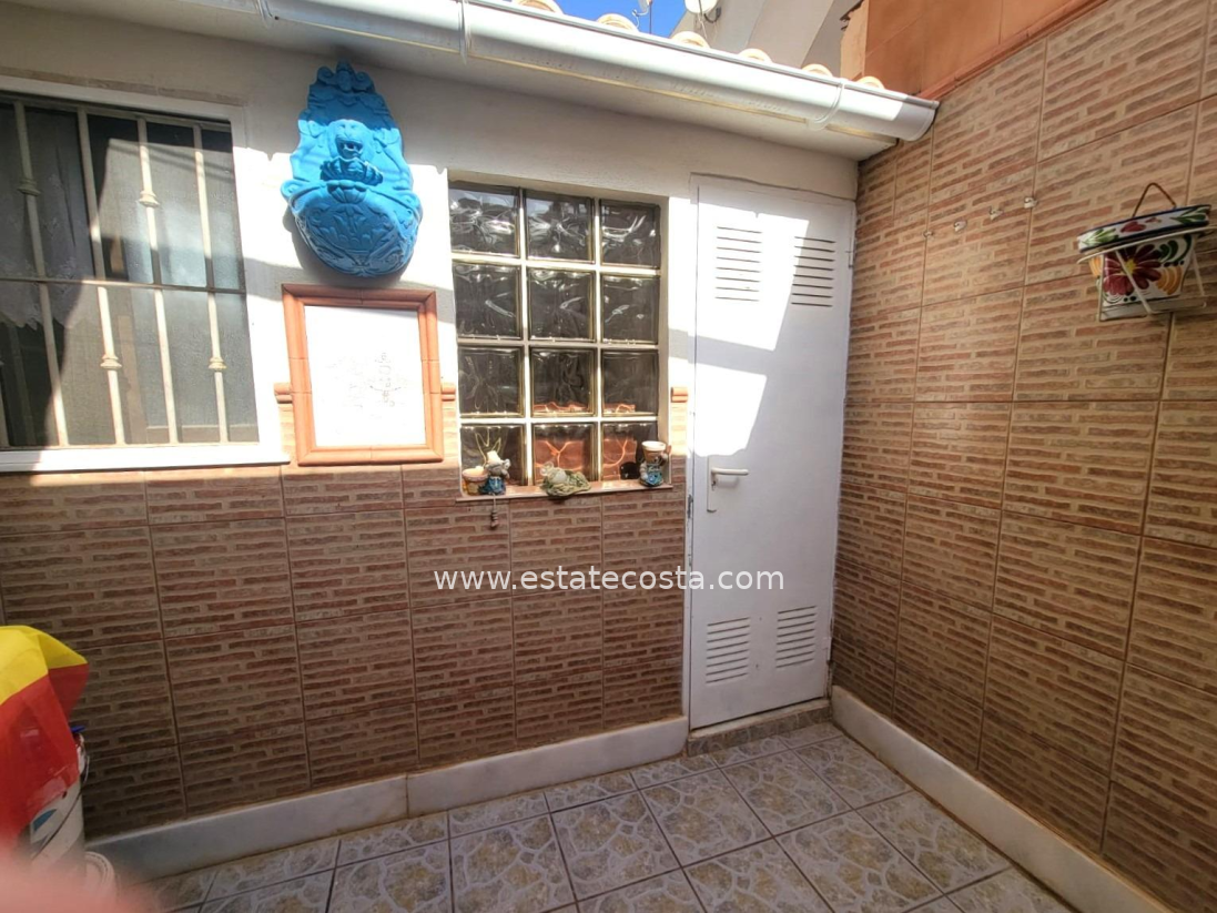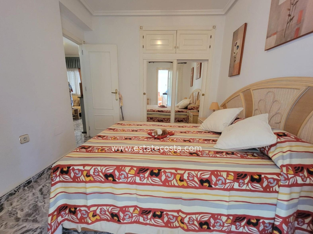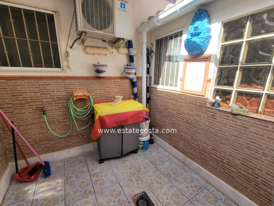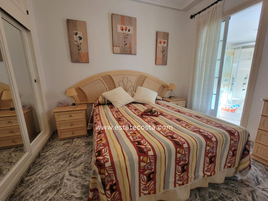 Lovely ground floor bungalow, in very good condition, South facing, with swimming pool in Los Frutales area. It consists of a large cozy front terrace, a glass-enclosed porch converted into a Summer living room, a living room, a fully equipped semi-open kitchen with access to a back patio, two double bedrooms (main bedroom with an en-suite bathroom), 2 bathrooms with showers and two storage rooms. Furnished. Air conditioning. You can park your vehicle in front of the property. All located in a nice and closed Residential with swimming pool and gardens, about a 20-minute walk from the beach "Los Locos" and "Torre del Moro" park. With all services, restaurants, cafes, supermarkets, bus stops, etc., nearby.