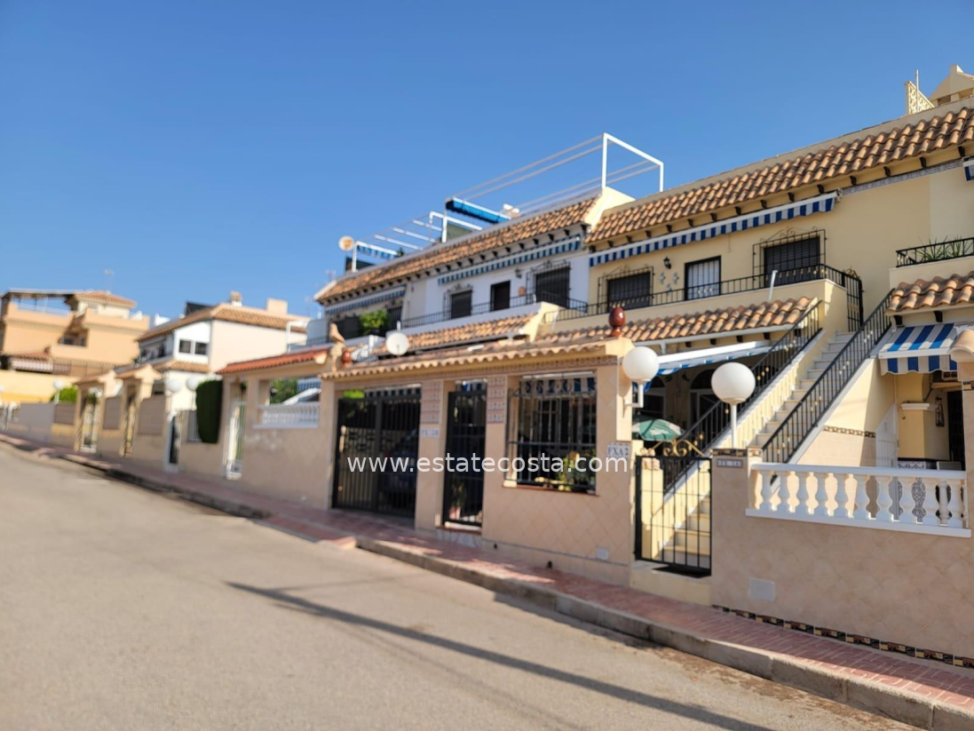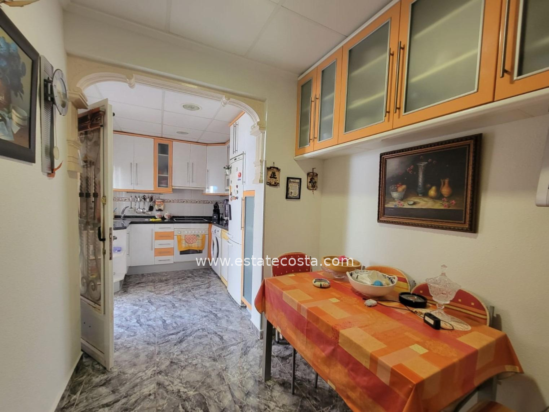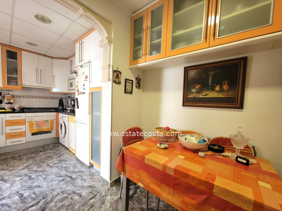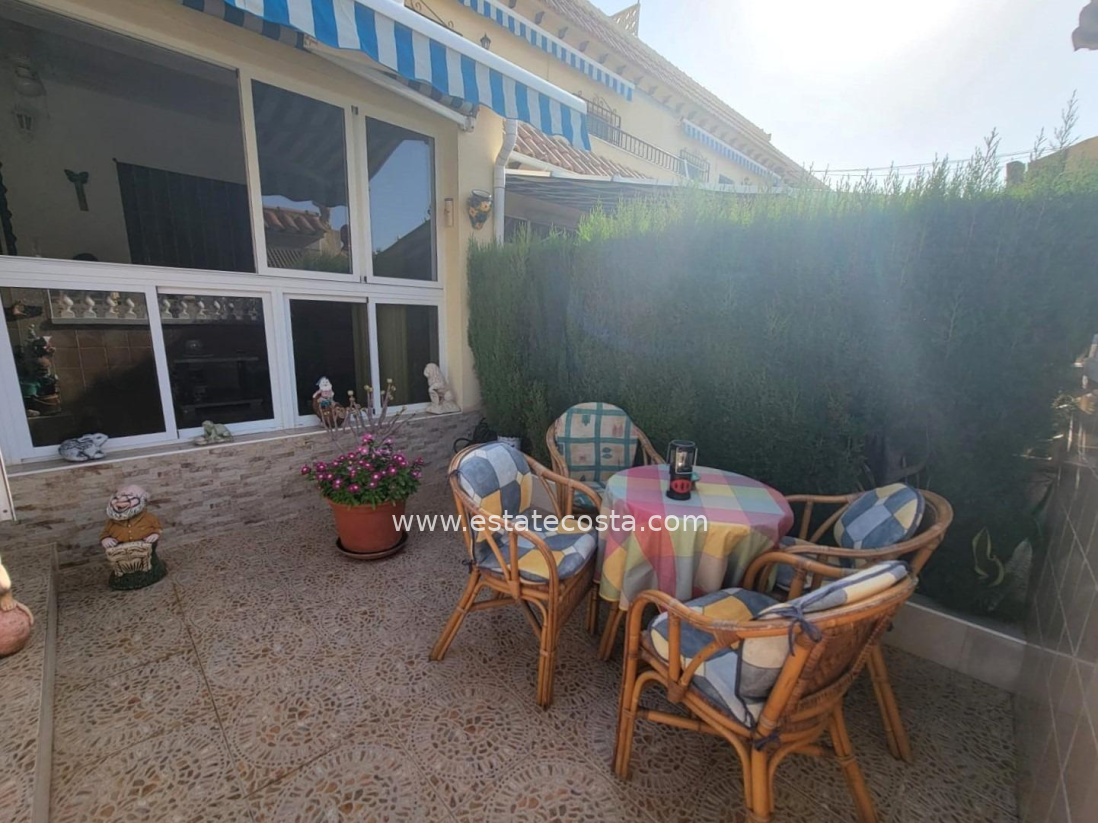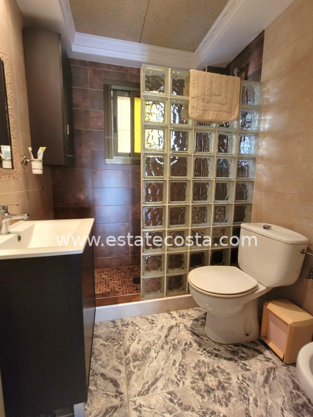Lovely ground floor bungalow, in very good condition, South facing, with swimming pool in Los Frutales area. It consists of a large cozy front terrace, a glass-enclosed porch converted into a Summer living room, a living room, a fully equipped semi-open kitchen with access to a back patio, two double bedrooms (main bedroom with an en-suite bathroom), 2 bathrooms with showers and two storage rooms. Furnished. Air conditioning. You can park your vehicle in front of the property. All located in a nice and closed Residential with swimming pool and gardens, about a 20-minute walk from the beach "Los Locos" and "Torre del Moro" park. With all services, restaurants, cafes, supermarkets, bus stops, etc., nearby.