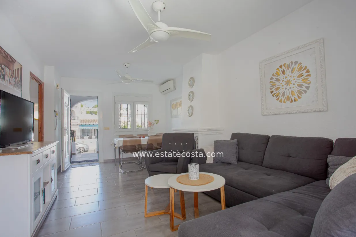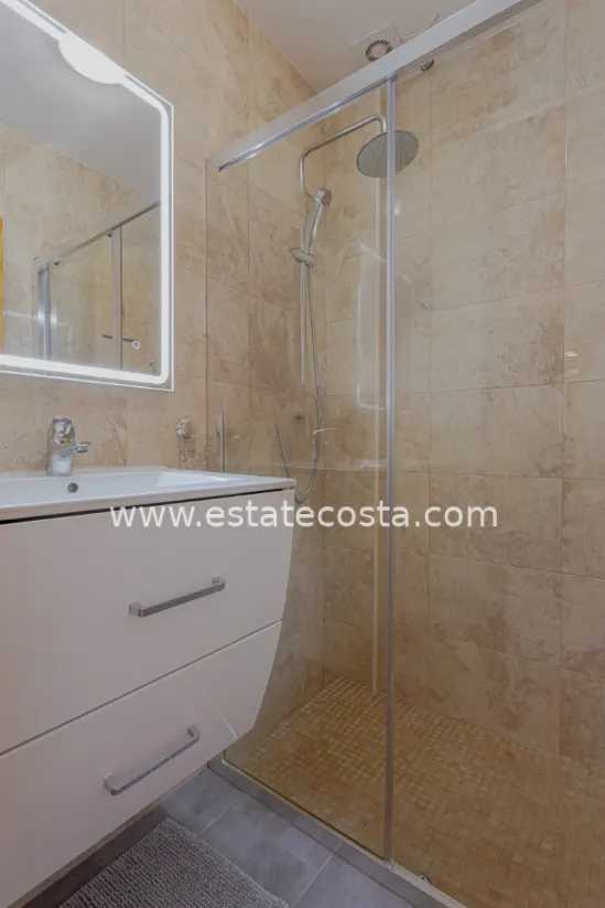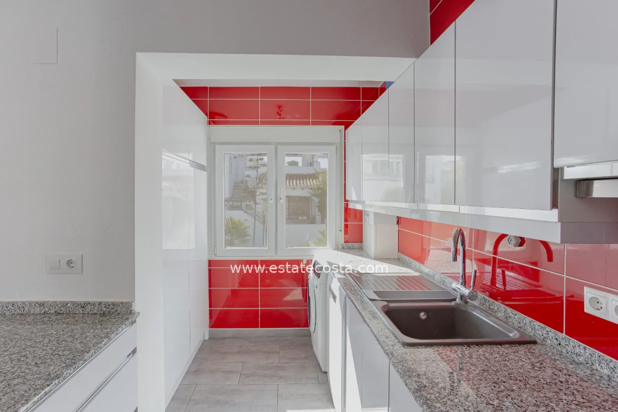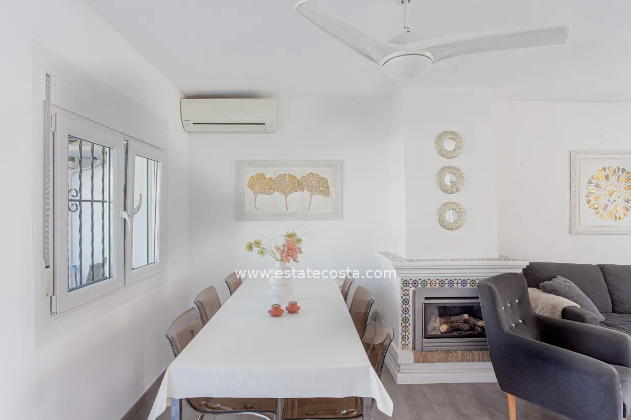 This charming townhouse is located in the well-known Verdemar urbanisation in Villamartín (Orihuela Costa). The property has been renovated and offers 3 bedrooms, 2 bathrooms and a guest toilet, providing a comfortable and functional layout.On the main floor, you will find a spacious living room, a fully equipped kitchen, and a guest toilet. From this level, there is access to two terraces: one at the front with morning sun, and another one facing south, perfect to enjoy the sun all day long.The upper floor is dedicated to the sleeping area, with 3 bedrooms and 2 bathrooms (one with shower and one with bathtub). On the lower level, there is a large 45 m² south-facing terrace, ideal for relaxing or enjoying the Mediterranean climate.The top floor offers a 22 m² solarium with outdoor shower and storage space, perfect for sunbathing or creating a chill-out area.Located close to all amenities, golf courses, and just a few minutes from the beaches of Campoamor and Cabo Roig, this property offers comfort, outdoor space and an excellent location.