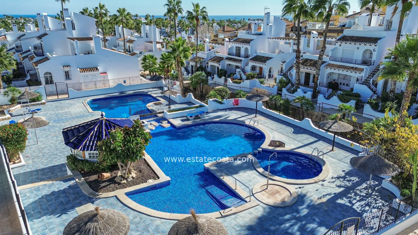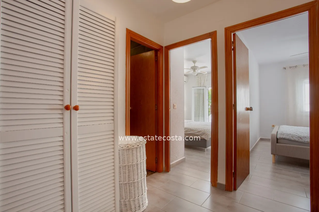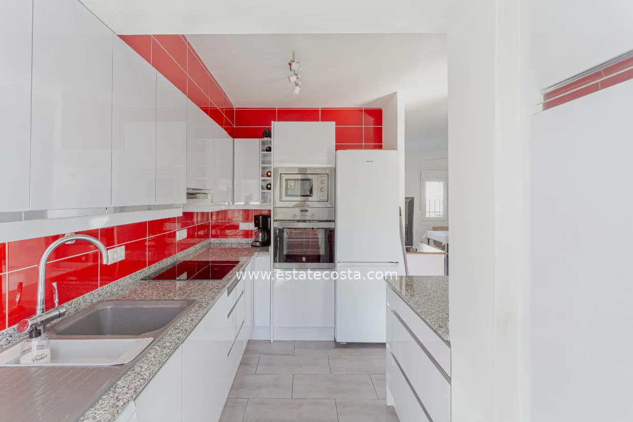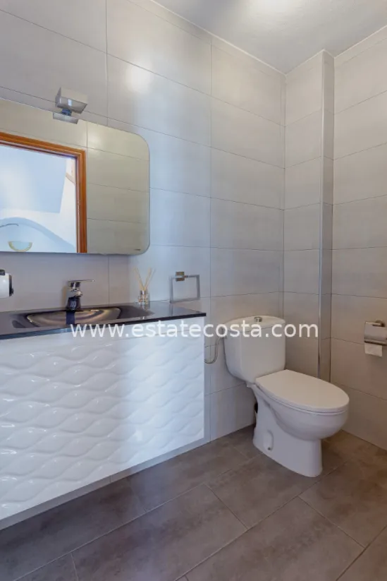 This charming townhouse is located in the well-known Verdemar urbanisation in Villamartín (Orihuela Costa). The property has been renovated and offers 3 bedrooms, 2 bathrooms and a guest toilet, providing a comfortable and functional layout.On the main floor, you will find a spacious living room, a fully equipped kitchen, and a guest toilet. From this level, there is access to two terraces: one at the front with morning sun, and another one facing south, perfect to enjoy the sun all day long.The upper floor is dedicated to the sleeping area, with 3 bedrooms and 2 bathrooms (one with shower and one with bathtub). On the lower level, there is a large 45 m² south-facing terrace, ideal for relaxing or enjoying the Mediterranean climate.The top floor offers a 22 m² solarium with outdoor shower and storage space, perfect for sunbathing or creating a chill-out area.Located close to all amenities, golf courses, and just a few minutes from the beaches of Campoamor and Cabo Roig, this property offers comfort, outdoor space and an excellent location.