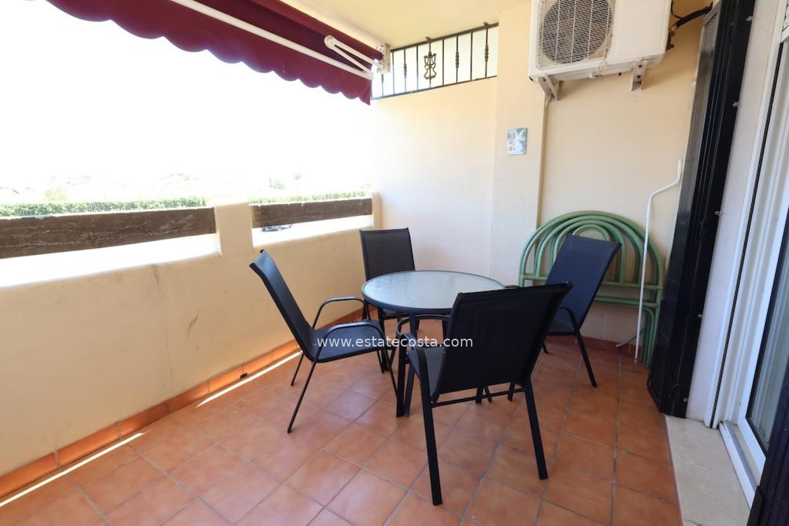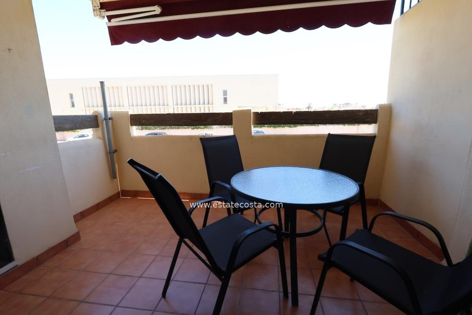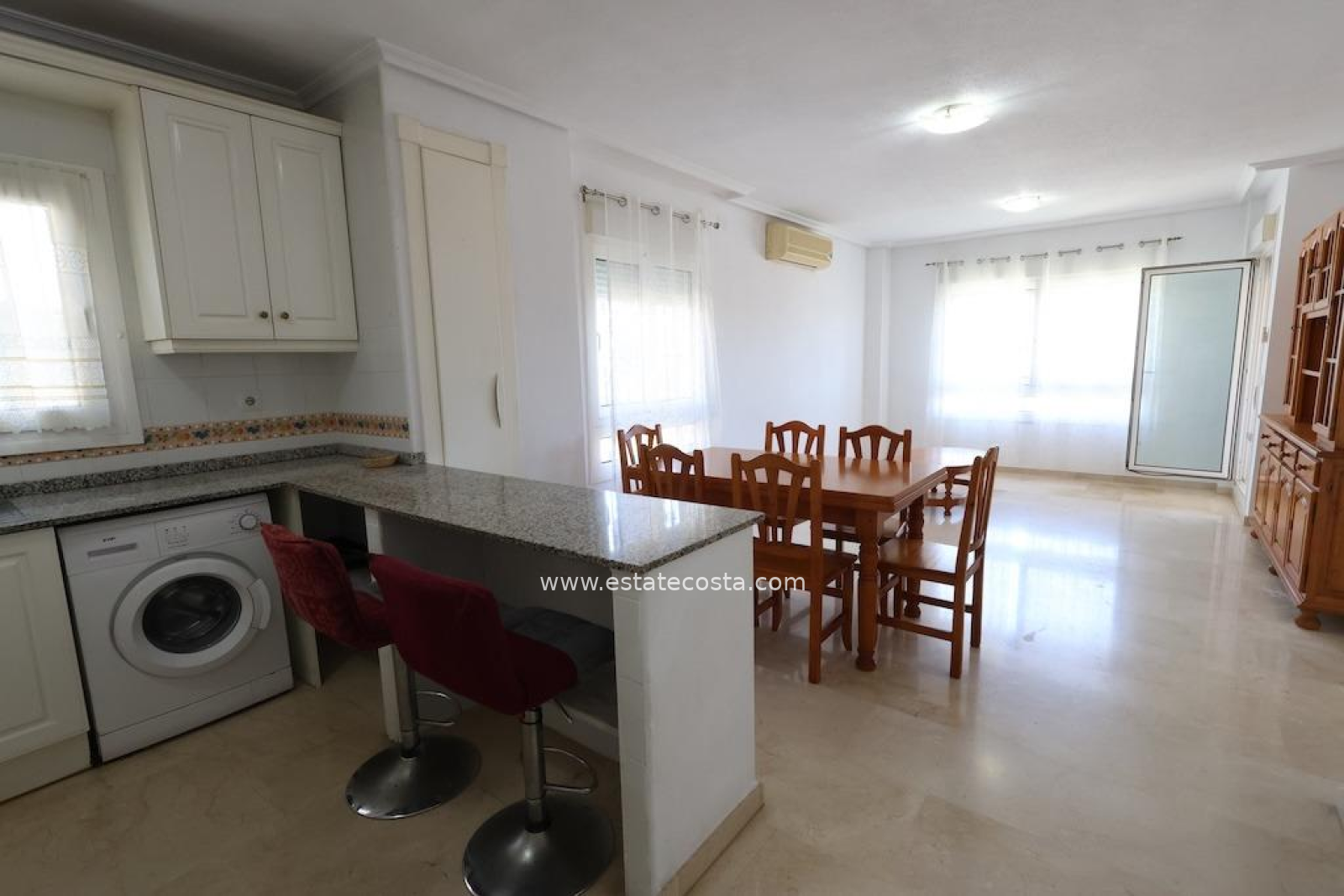 For sale a large two-bedroom, two-bathroom ground floor apartment is for sale. It's organized into a condominium with a swimming pool and lawn, located in the Jumia 2 development in Playa Flamenca. The apartment faces west, with access to the pool from the living room via the terrace and from the bedroom via the terrace. The apartment has 95 square meters of floor space and was built in a building dating back to 2001. The apartment consists of a small entrance hall, a spacious living room with a fully equipped American kitchen, two separate bedrooms with built-in wardrobes, and two full-size bathrooms, one of which is located in the master bedroom. It is sold furnished, with appliances included, and air conditioning in the living room.
