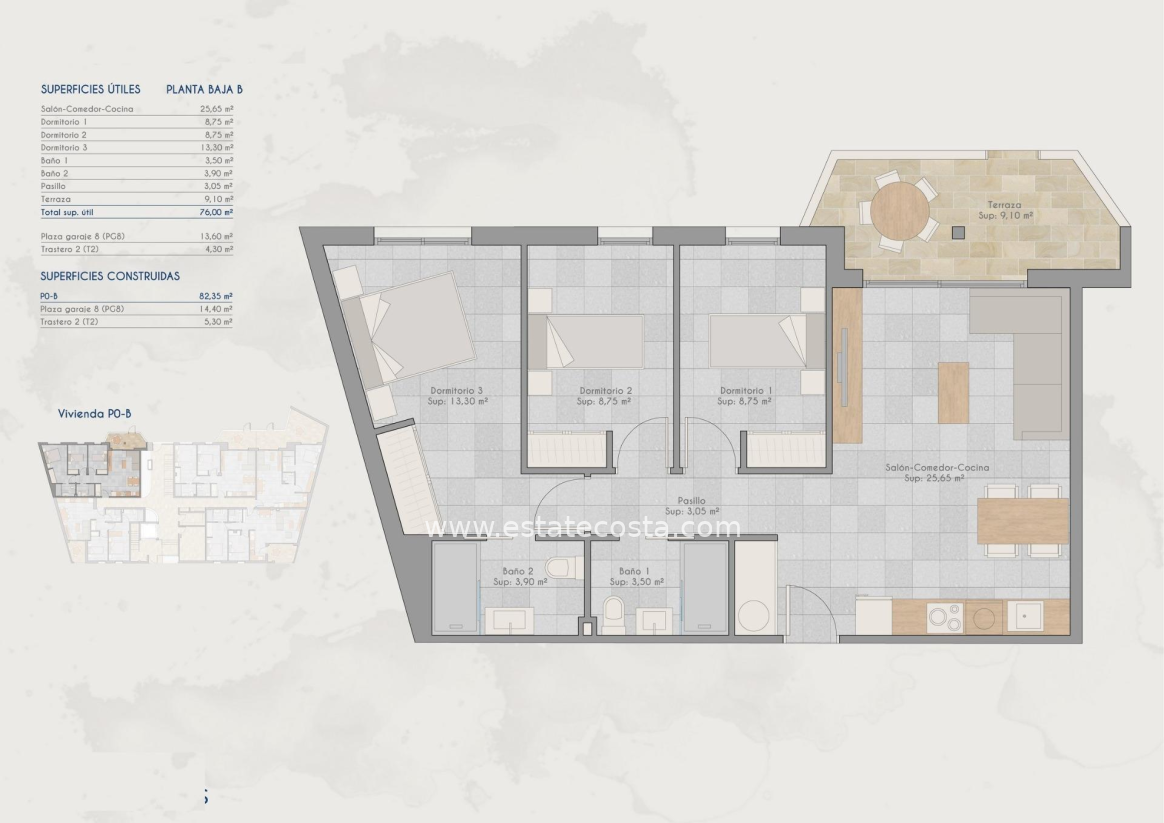 Apartamentos de nueva construcción en venta en Lo Pagan (San Pedro del Pinatar) cerca de la playa Vida mediterránea moderna en Lo Pagan Descubra estos elegantes apartamentos de nueva construcción en venta en Lo Pagan, una encantadora zona costera dentro de San Pedro del Pinatar, en la hermosa Costa Cálida. Situada en el conocido barrio de Los Cuarteros, esta promoción residencial ofrece un estilo de vida privilegiado a solo 500 metros de la playa y cerca de todos los servicios esenciales, restaurantes, tiendas y zonas de ocio. Lo Pagan es famosa por su relajado ambiente costero, las tranquilas aguas del Mar Menor y más de 300 días de sol al año. La zona combina el encanto tradicional español con las comodidades modernas, lo que la convierte en un destino ideal tanto para vivir como para pasar las vacaciones. Apartamentos contemporáneos con terrazas y soláriums privados La promoción ofrece una selección de apartamentos en planta baja y planta intermedia con amplias terrazas, así como exclusivos áticos con soláriums privados en la azotea. Los soláriums incluyen una pérgola y una zona de barbacoa, lo que crea el entorno perfecto para comer al aire libre y relajarse bajo el sol del Mediterráneo. Cada propiedad ha sido diseñada para combinar la arquitectura contemporánea con el cálido estilo mediterráneo. La cocina abierta se integra a la perfección con el salón y el comedor, creando espacios luminosos y confortables. Las amplias terrazas amplían las zonas interiores y son el lugar perfecto para desayunar al aire libre o celebrar reuniones por la noche. Los dormitorios cuentan con armarios empotrados y los modernos cuartos de baño están totalmente equipados, ofreciendo comodidad y elegantes acabados en toda la vivienda. Características de calidad e instalaciones comunitarias Estas viviendas se han construido prestando atención a los detalles e incluyen especificaciones de alta calidad para garantizar el confort y la eficiencia. Cocina totalmente amueblada y equipada con electrodomésticos Baños completamente equipados con acabados modernos Aire acondicionado por conductos totalmente instalado Plaza de aparcamiento privada y trastero incluidos en cada propiedad Los residentes también pueden disfrutar de excelentes instalaciones comunitarias, como una piscina rodeada de zonas de relax y un gimnasio totalmente equipado, ideal para mantener un estilo de vida activo durante todo el año. Excelente ubicación en la Costa Cálida Esta promoción goza de una ubicación estratégica cerca de playas, campos de golf y destinos clave a lo largo de la costa. Playa de Villananitos 0,5 km Real Club Náutico de Lo Pagán 0,5 km Lo Romero Golf 10 km Aeropuerto Internacional de Murcia 40 km Cartagena 35 km Las playas cercanas del Mar Menor, como la Playa de La Puntica, son conocidas por su arena fina y sus aguas tranquilas, ideales para nadar, navegar y practicar deportes acuáticos. Su nueva casa junto al mar le espera Disfrute del sol, las playas y un vibrante estilo de vida costero en una de las zonas más codiciadas de la Costa Cálida. Póngase en contacto con nosotros hoy mismo para obtener más información sobre estos apartamentos de nueva construcción en Lo Pagán y asegúrese su lugar junto al mar.