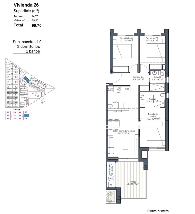 Apartamentos de nueva construcción en La Serena Golf-Los Alcázares, cerca de la playa Vida moderna frente al campo de golf en la Costa Cálida Descubra este exclusivo complejo residencial de nueva construcción situado en La Serena Golf, en Los Alcázares. Esta urbanización contemporánea cuenta con 66 elegantes apartamentos de 2 o 3 dormitorios y 2 baños, uno de ellos en suite, diseñados para ofrecer comodidad, elegancia y un excepcional estilo de vida mediterráneo a solo 300 metros del Mar Menor. Los Alcázares es una encantadora localidad costera conocida por su ambiente relajado, sus playas de arena y su largo paseo marítimo. Con más de 300 días de sol al año, la zona ofrece un entorno perfecto para la vida al aire libre, los deportes acuáticos y el golf. La localidad también cuenta con una amplia selección de restaurantes, tiendas, puertos deportivos e instalaciones deportivas, lo que la convierte en un destino muy deseable tanto para la residencia permanente como para las vacaciones. Apartamentos con terrazas, jardines y soláriums privados El complejo residencial ofrece varios tipos de propiedades que se adaptan a diferentes estilos de vida. Los compradores pueden elegir entre apartamentos en planta baja con jardines privados, viviendas en plantas intermedias con amplias terrazas o áticos con terrazas y grandes soláriums en la azotea. Los soláriums incluyen una ducha exterior y ofrecen la opción de añadir una cocina de verano y un jacuzzi privado, creando un espacio ideal para relajarse y divertirse mientras se disfruta de las vistas abiertas al campo de golf y al paisaje circundante. Cada vivienda ha sido diseñada con interiores luminosos y espacios diáfanos que conectan a la perfección con las zonas exteriores. Servicios estilo resort y zonas comunes excepcionales Una de las características más distintivas de esta promoción es su concepto de estilo resort. Los residentes pueden disfrutar de una espectacular piscina estilo laguna de aproximadamente 190 m2 con acceso estilo playa y zonas de relax con camas balinesas. Las instalaciones comunes adicionales incluyen jardines paisajísticos, una zona de spa, gimnasio y sauna situados en el sótano. El complejo también ofrece un parque infantil, dos pistas de petanca y aseos comunes cerca de la zona de la piscina, creando un ambiente acogedor para los residentes y los invitados. Acabados de calidad y características modernas Los apartamentos están construidos con materiales modernos y especificaciones de alta calidad diseñadas para ofrecer comodidad y estilo. Cocina totalmente equipada con electrodomésticos de acabado en cristal blanco Baños con tocadores, mamparas de ducha y espejos retroiluminados Persianas motorizadas Paquete de iluminación básico Aire acondicionado por conductos totalmente instalado Plaza de aparcamiento subterráneo para cada propiedad Aparcamiento subterráneo para bicicletas y trasteros opcionales Ubicación privilegiada cerca de la playa y el golf Playa del Mar Menor a 0,3 km Golf La Serena junto a la urbanización Centro de Los Alcázares a 2 km Cartagena a 22 km Murcia a 40 km Aeropuerto Internacional de la Región de Murcia a 30 km Aeropuerto de Alicante-Elche a 90 km Las tranquilas y poco profundas aguas del Mar Menor son ideales para nadar, navegar y practicar paddle surf durante todo el año. Asegure su vivienda en La Serena Golf Resort Estos modernos apartamentos combinan la vida junto a la playa, vistas al campo de golf desde la mayoría de las unidades y comodidades estilo resort en una de las zonas más atractivas de la Costa Cálida. Póngase en contacto con nosotros hoy mismo para recibir más información o concertar una visita y asegurar su nueva vivienda en La Serena Golf-Los Alcázares.