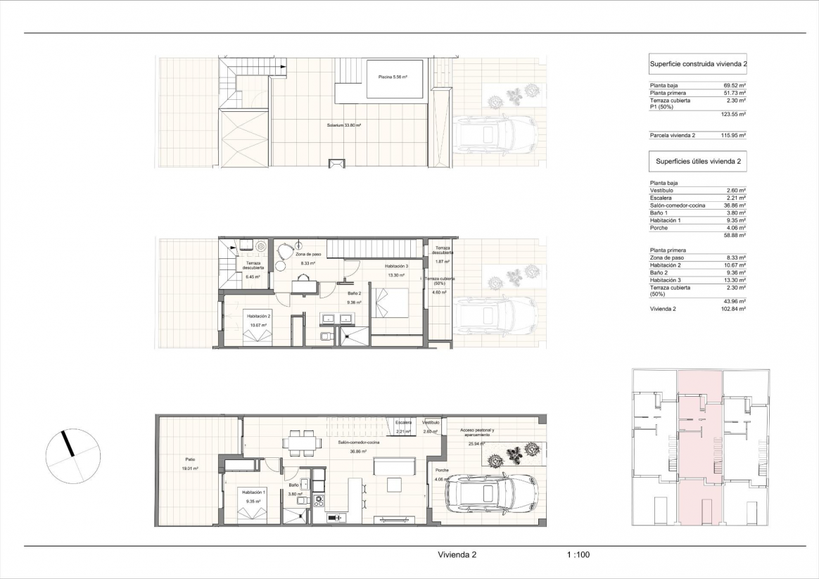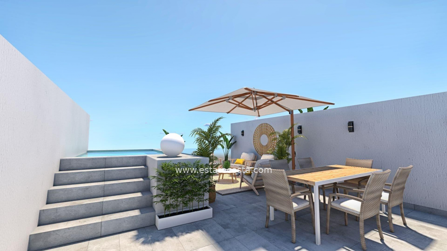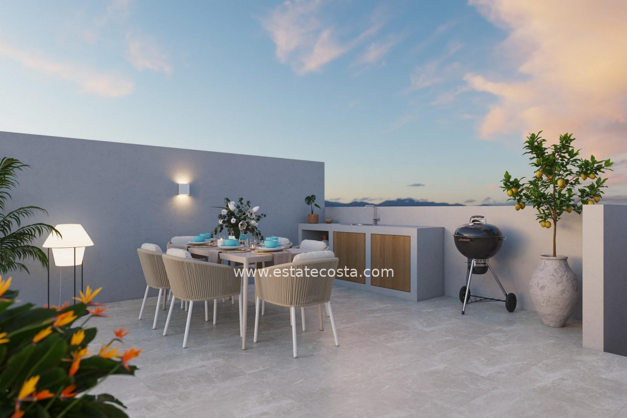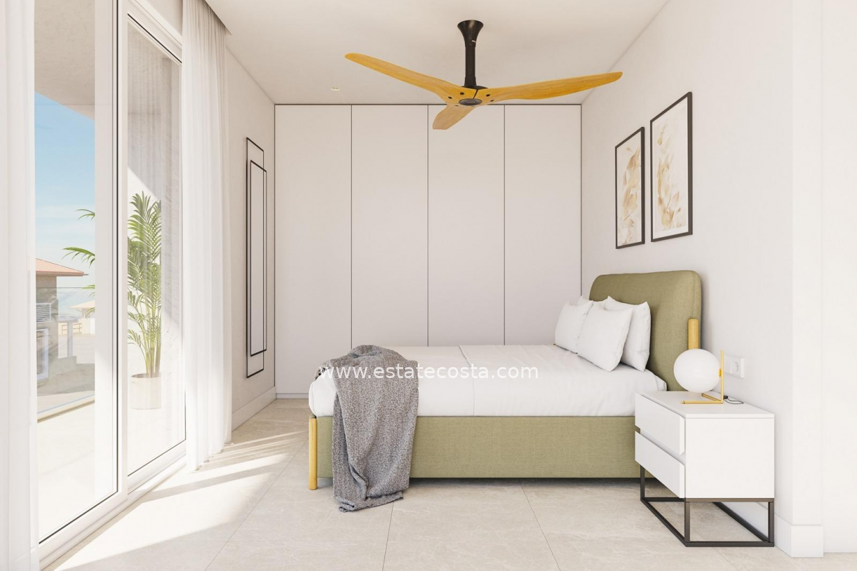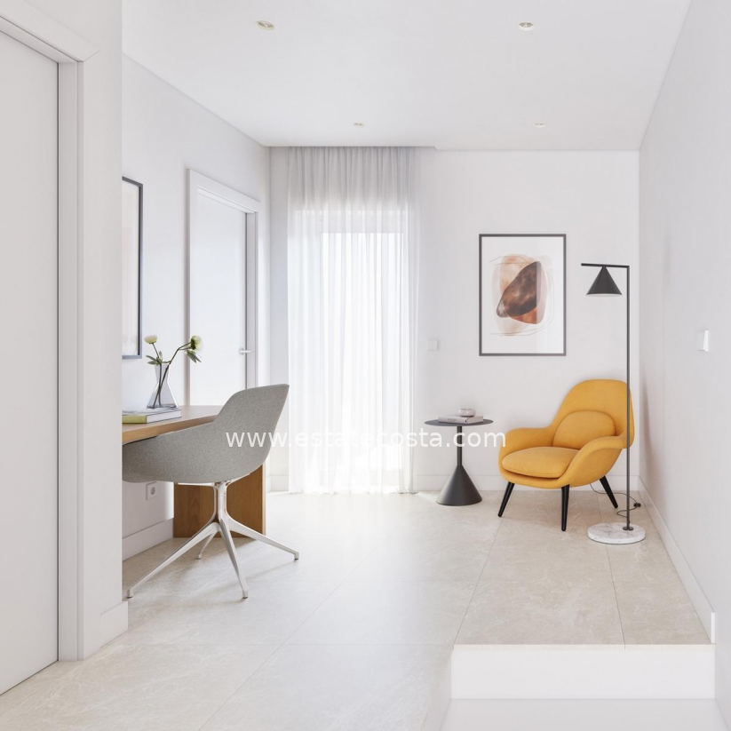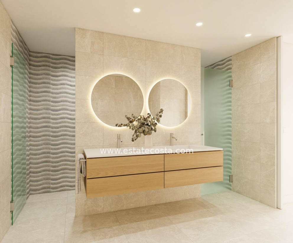 Wyjątkowy projekt domów które dzięki orientacji południowo-wschodniej i lokalizacji w uznanej dzielnicy mieszkalnej pozwalają cieszyć się w pełni śródziemnomorskim życiem. Na głównym piętrze zaprojektowano otwartą i jasną przestrzeń, w której salon, jadalnia i kuchnia są połączone przesuwanymi drzwiami z wewnętrznym patio do użytku na zewnątrz i korzystania z niego przez cały rok. Sypialnia z dostępem do patio i łazienka uzupełniają rozkład tego piętra. Na piętrze znajduje się przedpokój prowadzący do dwóch kolejnych sypialni, łazienki oraz solarium z prywatnym basenem.