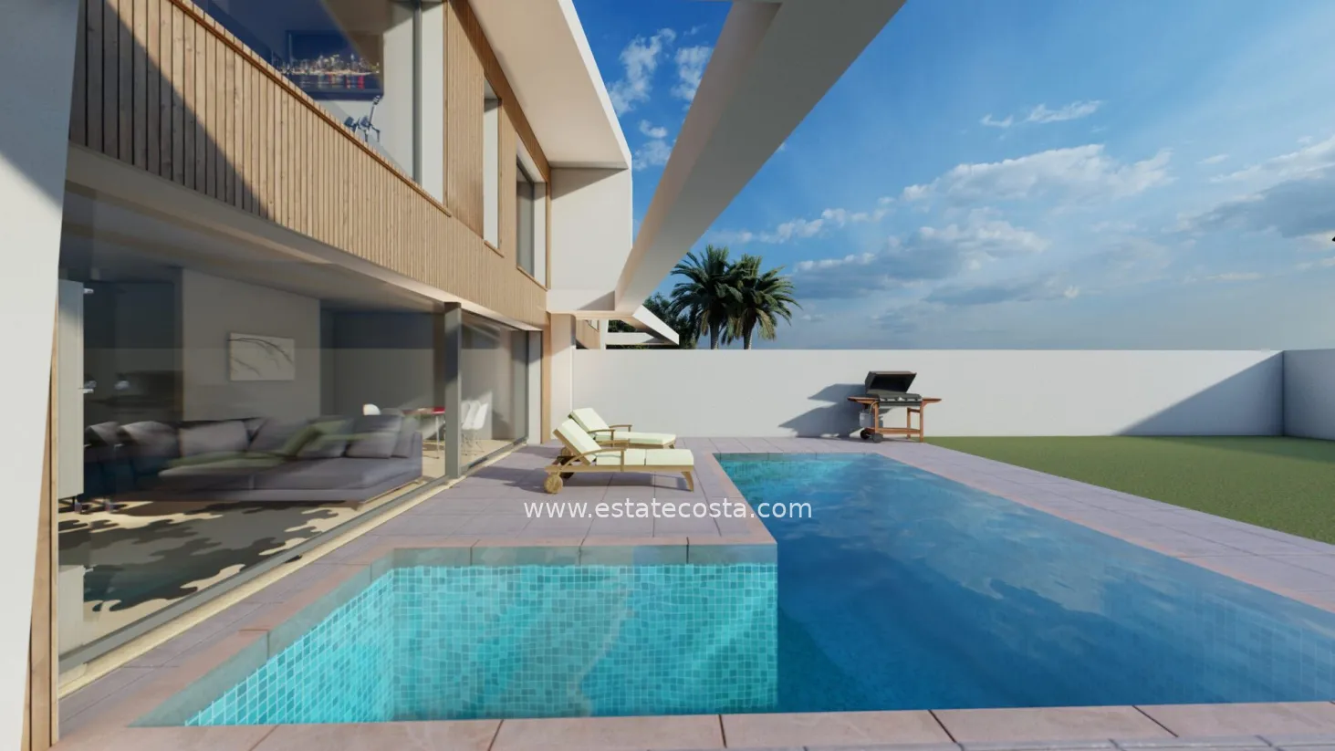 Dom wyróżnia się nowoczesnym, minimalistycznym designem z prostymi liniami i dużymi oknami, które zapewniają doskonałe doświetlenie wnętrz. Układ pomieszczeń oferuje 3 sypialnie i 3 łazienki, rozmieszczone na dwóch kondygnacjach (parter i piętro) z opcjonalną piwnicą. Każda willa posiada prywatny basen (zazwyczaj o wymiarach ok. 6x3 m), ogród oraz miejsce parkingowe na terenie posesji.