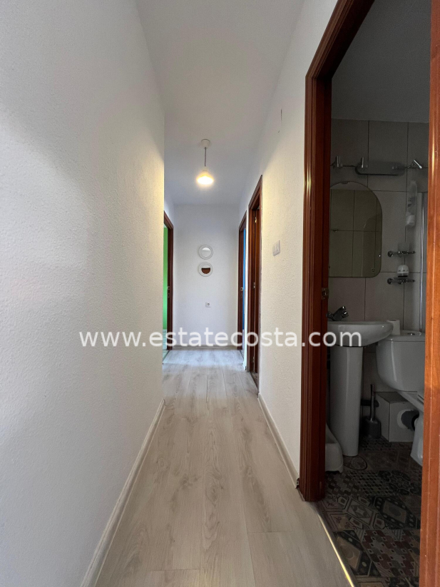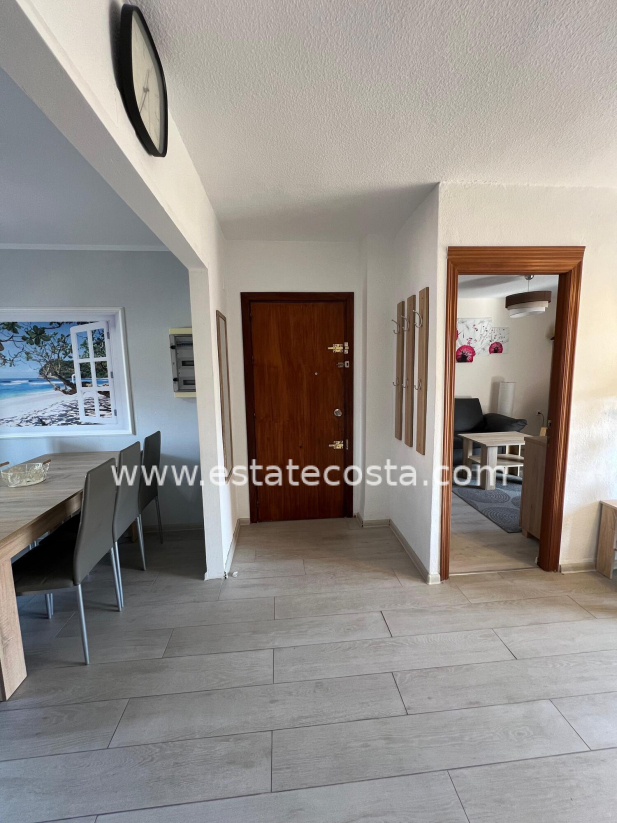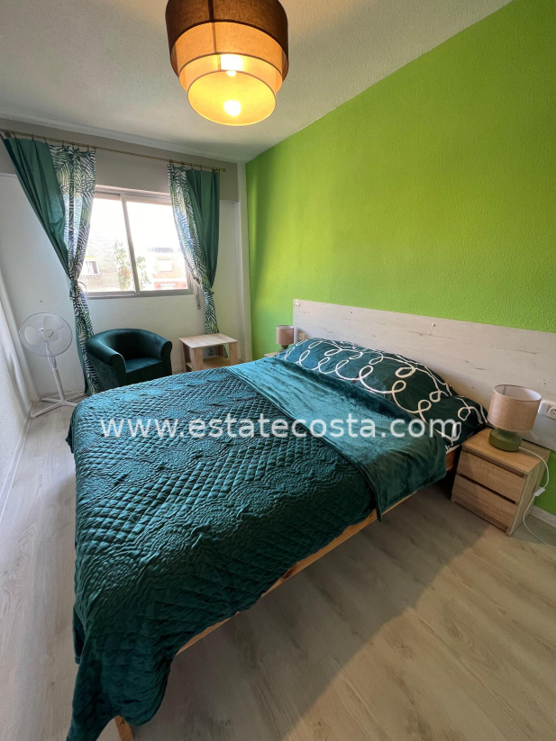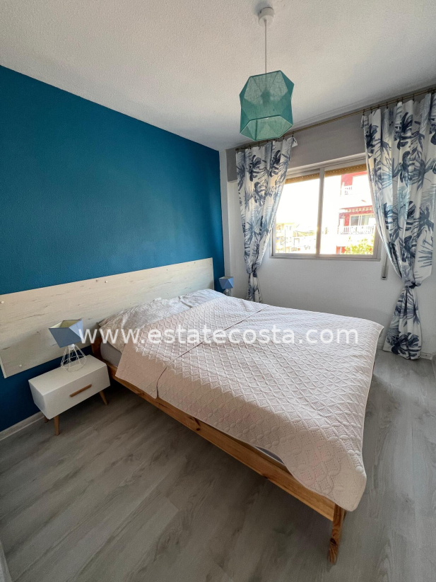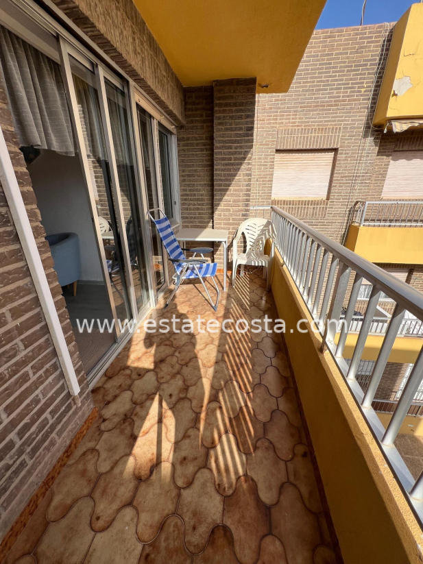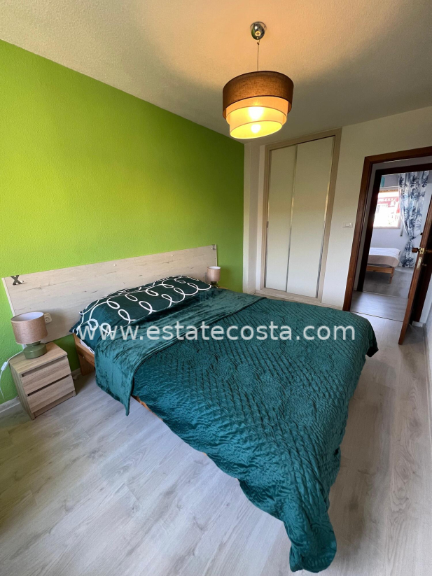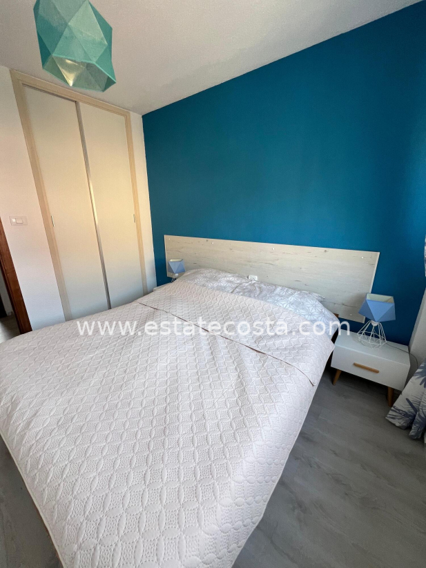 Apartament znajduje się na drugim piętrze budynku, na zamkniętym osiedlu wyposażonym w basen. Nieruchomość składa się z 3 sypialni, 2 łazienek, otwartej kuchni oraz salonu. Dodatkowo posiada pomieszczenie gospodarcze oraz taras skierowany do wnętrza osiedla, z widokiem na basen. Mieszkanie jest odnowione i wyposażone, również w klimatyzację.
