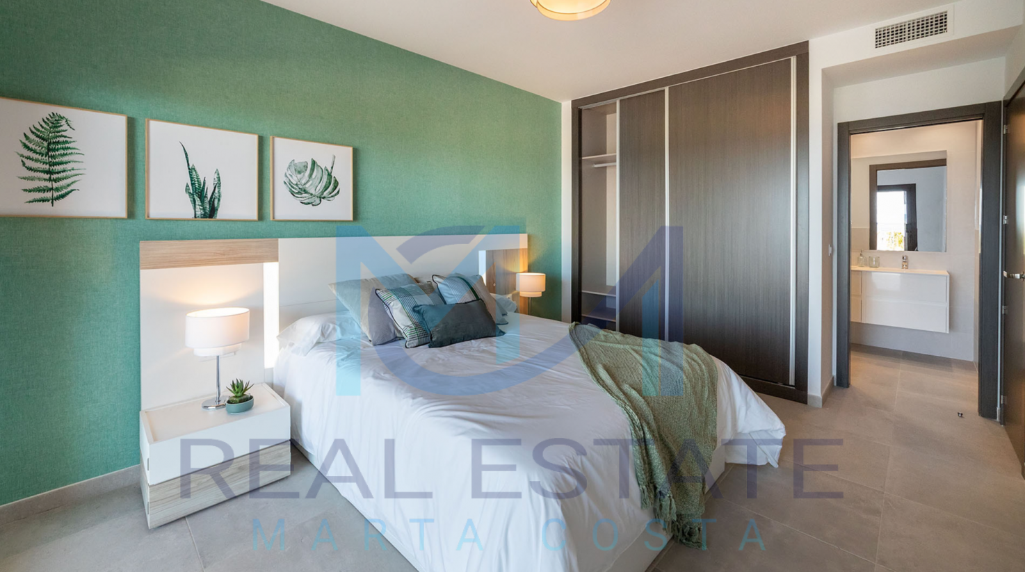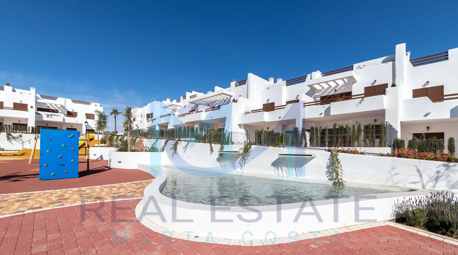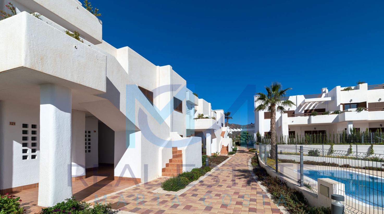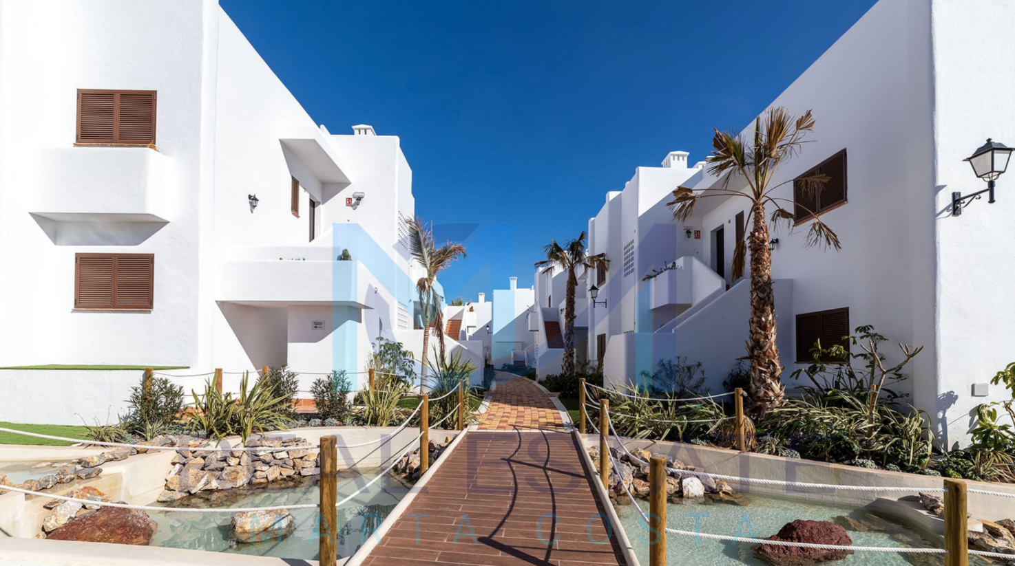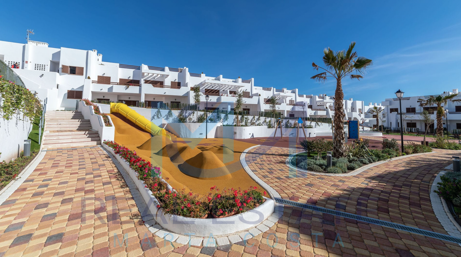 Nowoczesny bungalow górny w zamkniętym osiedlu składa się z dwóch sypialni, dwóch łazienek, umeblowanej i wyposażonej kuchni, salonu z wyjściem na prywatny taras oraz prywatnym solarium. W częściach wspólnych osiedla, znajdują się trzy baseny, dwa dla dorosłych, w tym jeden podgrzewany, dwa dla dzieci z atrakcjami wodnymi, a także podgrzewane jacuzzi z rozległą powierzchnią naturalnego trawnika. Basen oferuje również wspaniałe widoki na morze, co daje wrażenie kąpieli w jego wodach. Wewnętrzne ścieżki są wyłożone rozległą rodzimą roślinnością, a na terenie znajduje się długi strumień, który wpada do małego jeziora.