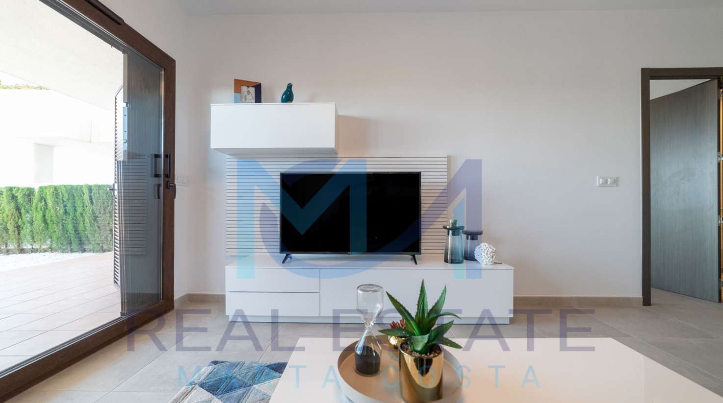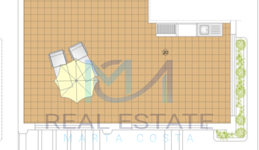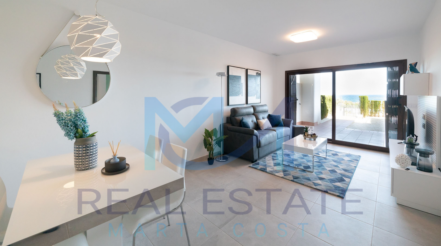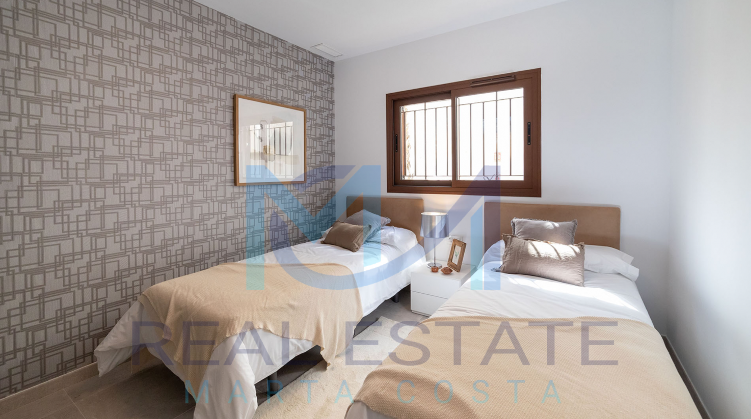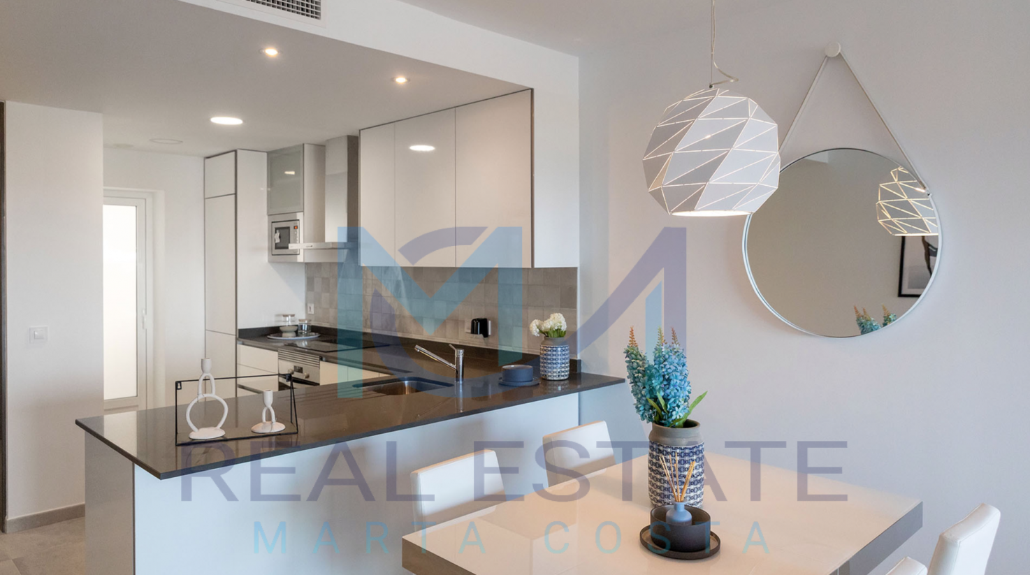 Nowoczesny bungalow górny w zamkniętym osiedlu składa się z dwóch sypialni, dwóch łazienek, umeblowanej i wyposażonej kuchni, salonu z wyjściem na prywatny taras oraz prywatnym solarium. W częściach wspólnych osiedla, znajdują się trzy baseny, dwa dla dorosłych, w tym jeden podgrzewany, dwa dla dzieci z atrakcjami wodnymi, a także podgrzewane jacuzzi z rozległą powierzchnią naturalnego trawnika. Basen oferuje również wspaniałe widoki na morze, co daje wrażenie kąpieli w jego wodach. Wewnętrzne ścieżki są wyłożone rozległą rodzimą roślinnością, a na terenie znajduje się długi strumień, który wpada do małego jeziora.