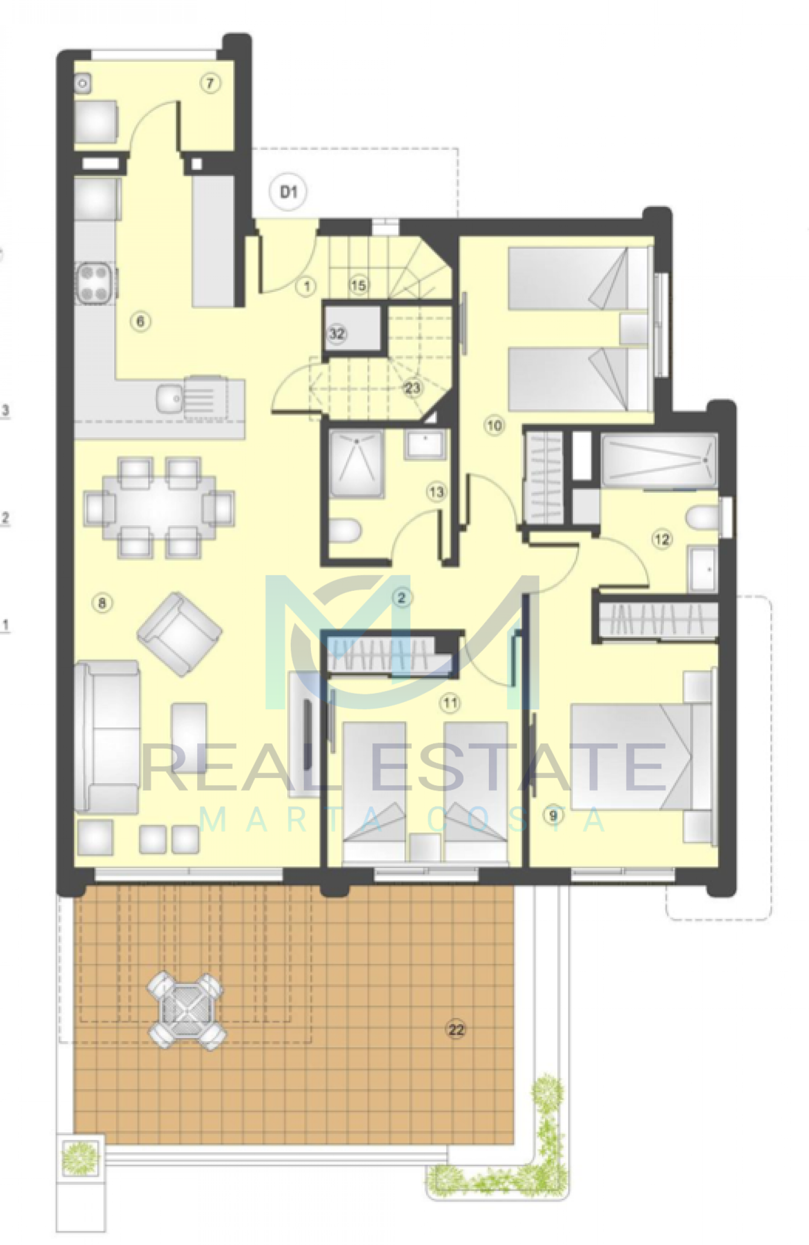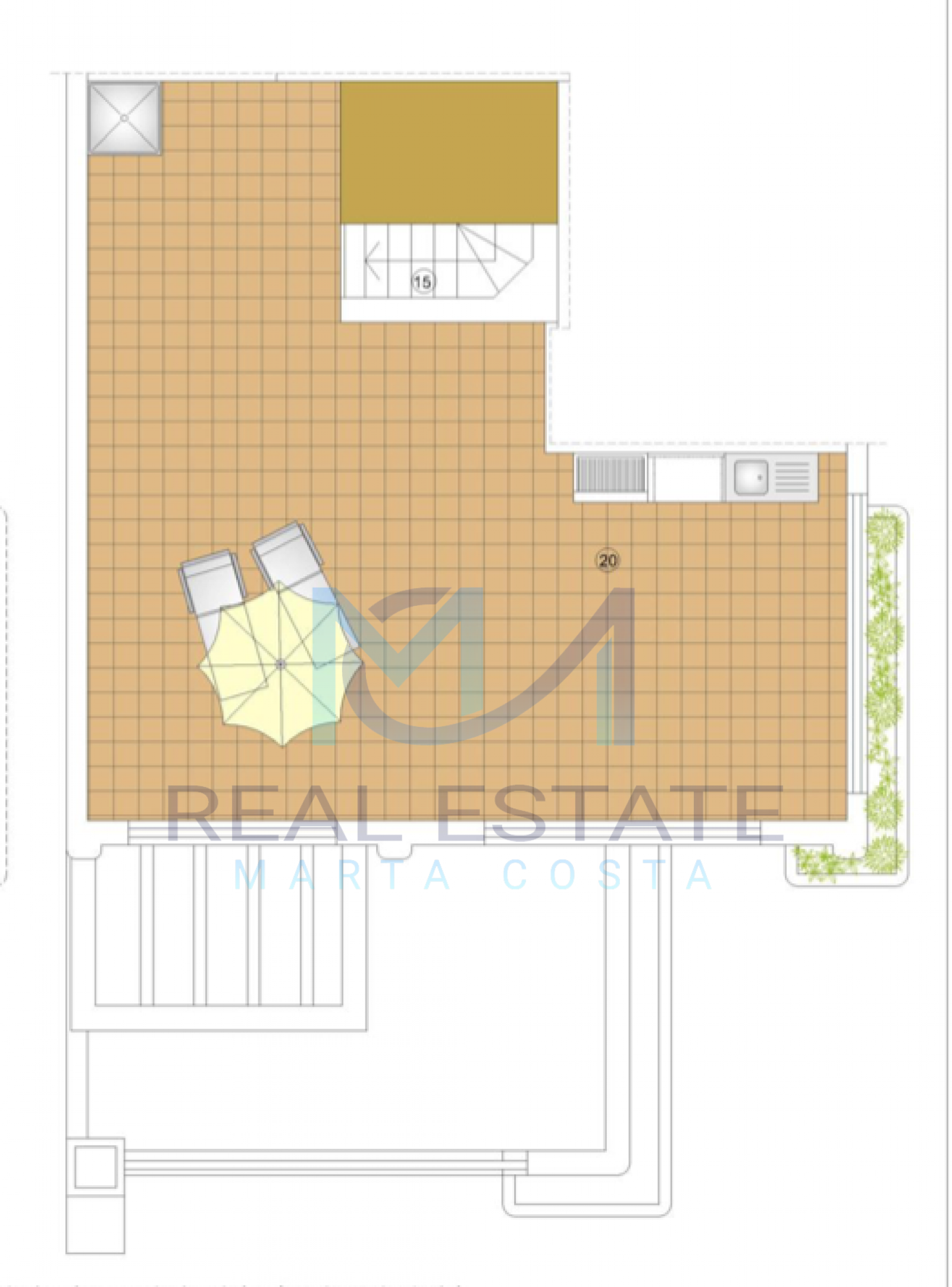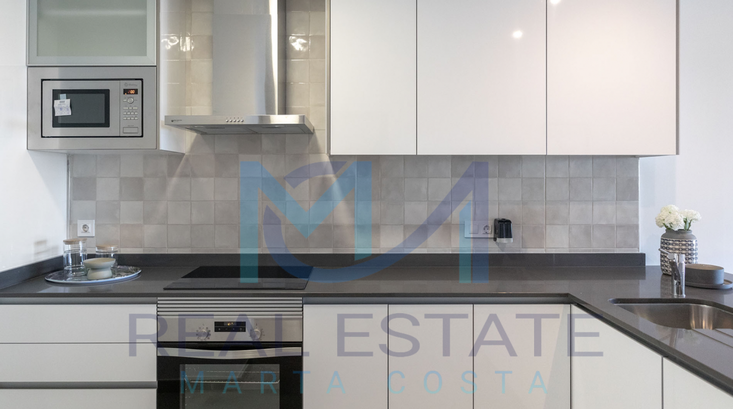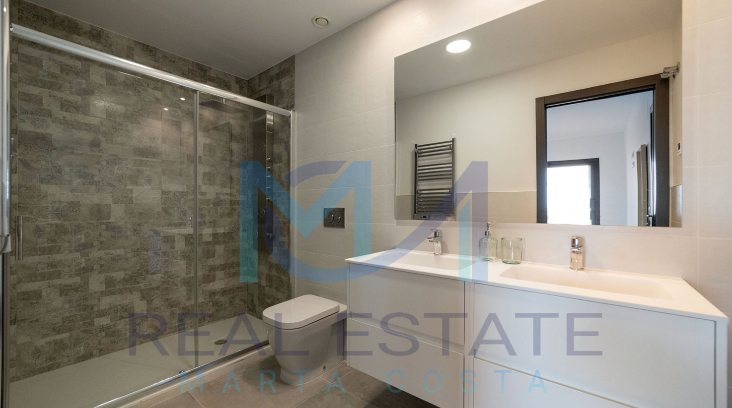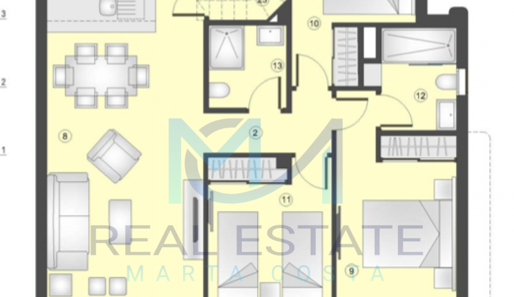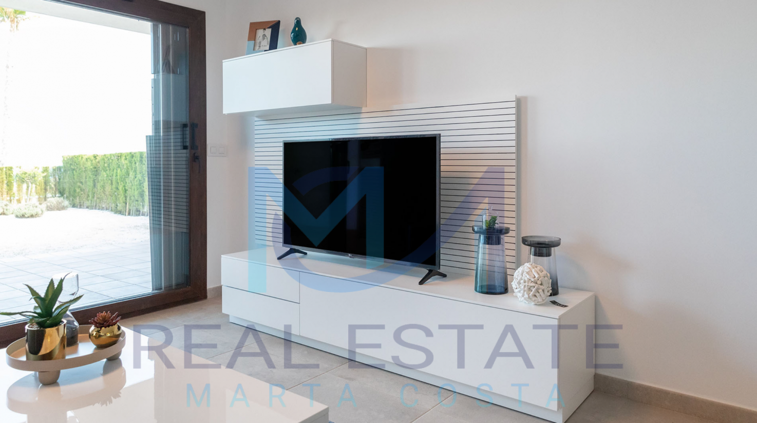 Nowoczesny bungalow górny w zamkniętym osiedlu składa się z dwóch sypialni, dwóch łazienek, umeblowanej i wyposażonej kuchni, salonu z wyjściem na prywatny taras oraz prywatnym solarium. W częściach wspólnych osiedla, znajdują się trzy baseny, dwa dla dorosłych, w tym jeden podgrzewany, dwa dla dzieci z atrakcjami wodnymi, a także podgrzewane jacuzzi z rozległą powierzchnią naturalnego trawnika. Basen oferuje również wspaniałe widoki na morze, co daje wrażenie kąpieli w jego wodach. Wewnętrzne ścieżki są wyłożone rozległą rodzimą roślinnością, a na terenie znajduje się długi strumień, który wpada do małego jeziora.