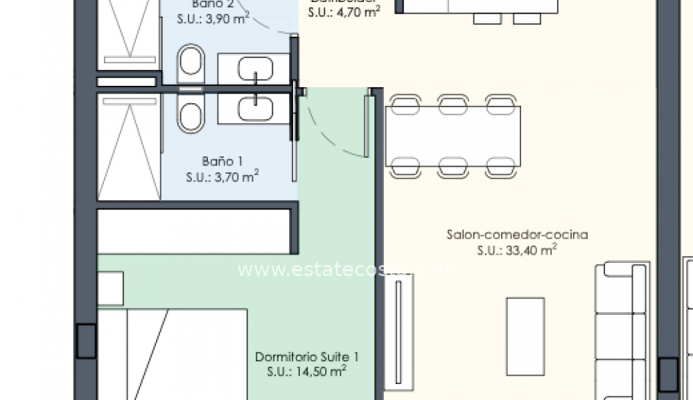 Nowoczesny apartament mieszczący się na pierwszym piętrze, posiada trzy sypialnie, dwie łazienki, kuchnię z salonem oraz balkon . Jego lokalizacja nie mogłaby być bardziej idealna. W ciągu zaledwie kilku minut możesz kąpać się na krystalicznie czystych plażach Costa Blanca, cieszyć się atmosferą barów na plaży lub uprawiać jedne z najbardziej zabawnych sportów wodnych lub żeglarskich. Będziesz jeszcze bliżej La Marquesa Golf, jednego z najpopularniejszych pól, zaledwie 10 minut jazdy samochodem. W tej samej okolicy, w Rojales, znajdziesz Aquapark, jeden z najlepszych parków wodnych, w których można cieszyć się z rodziną