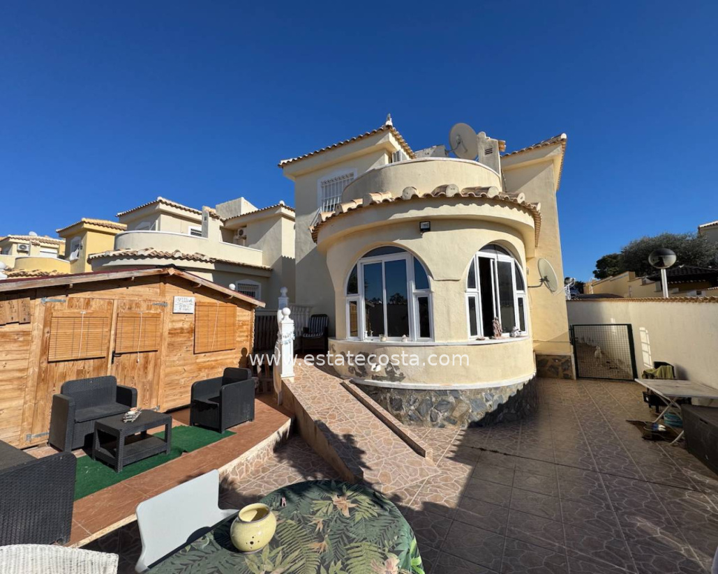 Ta zadbana, od strony południowo-zachodniej, wolnostojąca willa z trzema sypialniami i dwiema łazienkami znajduje się w Ciudad Quesada. Willa ma dwa piętra, przy czym na parterze znajduje się ładny taras słoneczny ze szklanymi zasłonami, przestronny salon z częścią wypoczynkową i jadalną, półotwarta, w pełni wyposażona kuchnia, sypialnia dwuosobowa z wbudowanymi szafami i łazienka. Na pierwszym piętrze znajdują się dwie kolejne sypialnie dwuosobowe, obie z własnymi szafami, druga łazienka i dostęp do pięknego, nasłonecznionego solarium. Dom stoi na przestronnej, zadbanej działce. Jest tam duży drewniany domek i mnóstwo miejsc parkingowych. Willa jest częściowo umeblowana.