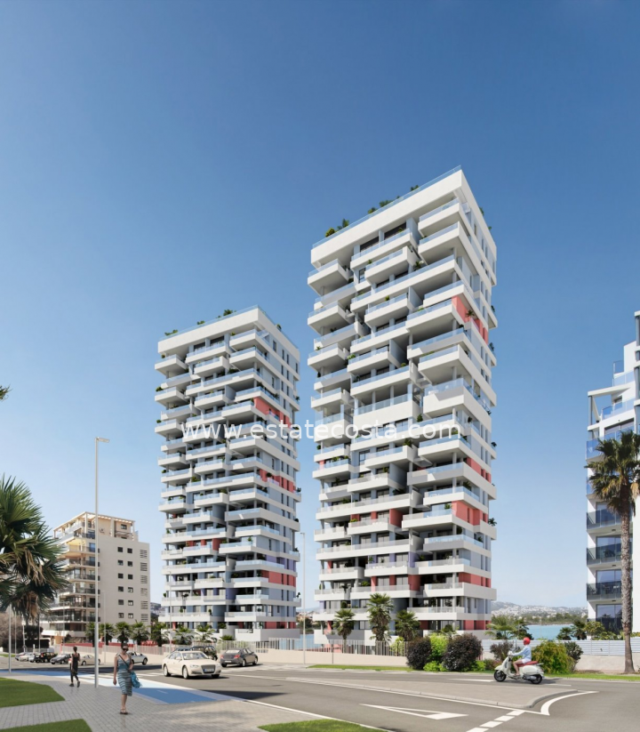 Nowy kompleks mieszkalny z 1, 2 i 3 sypialniami z dużymi tarasami - dwie wieże po 18 pięter z pięknymi apartamentami z widokiem na morze i słone jezioro w Calpe.