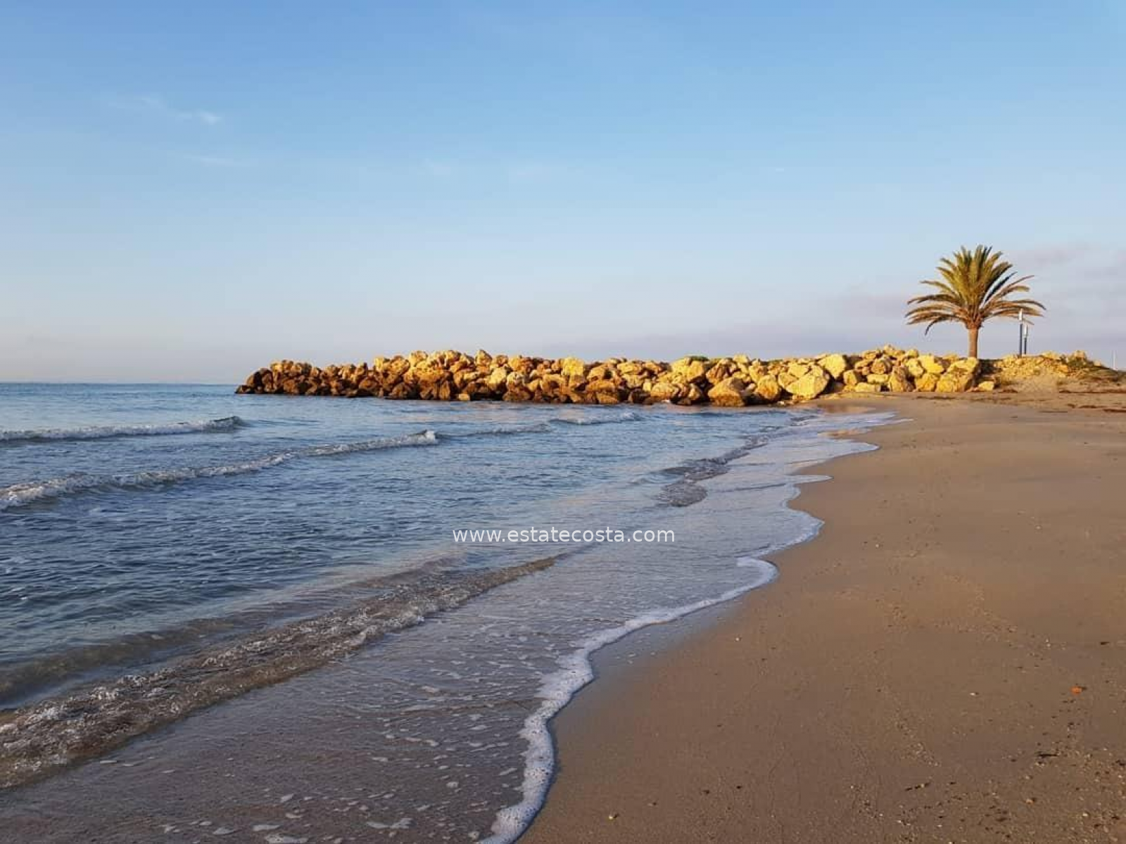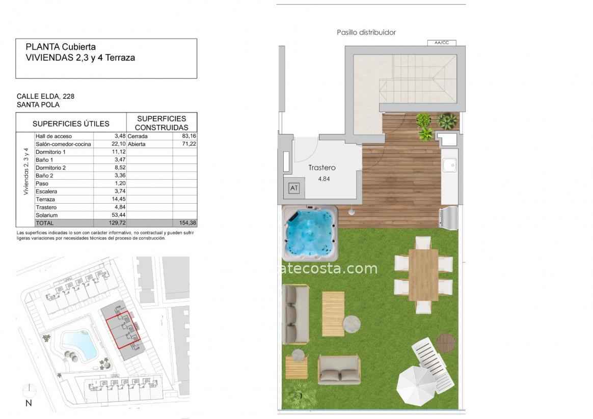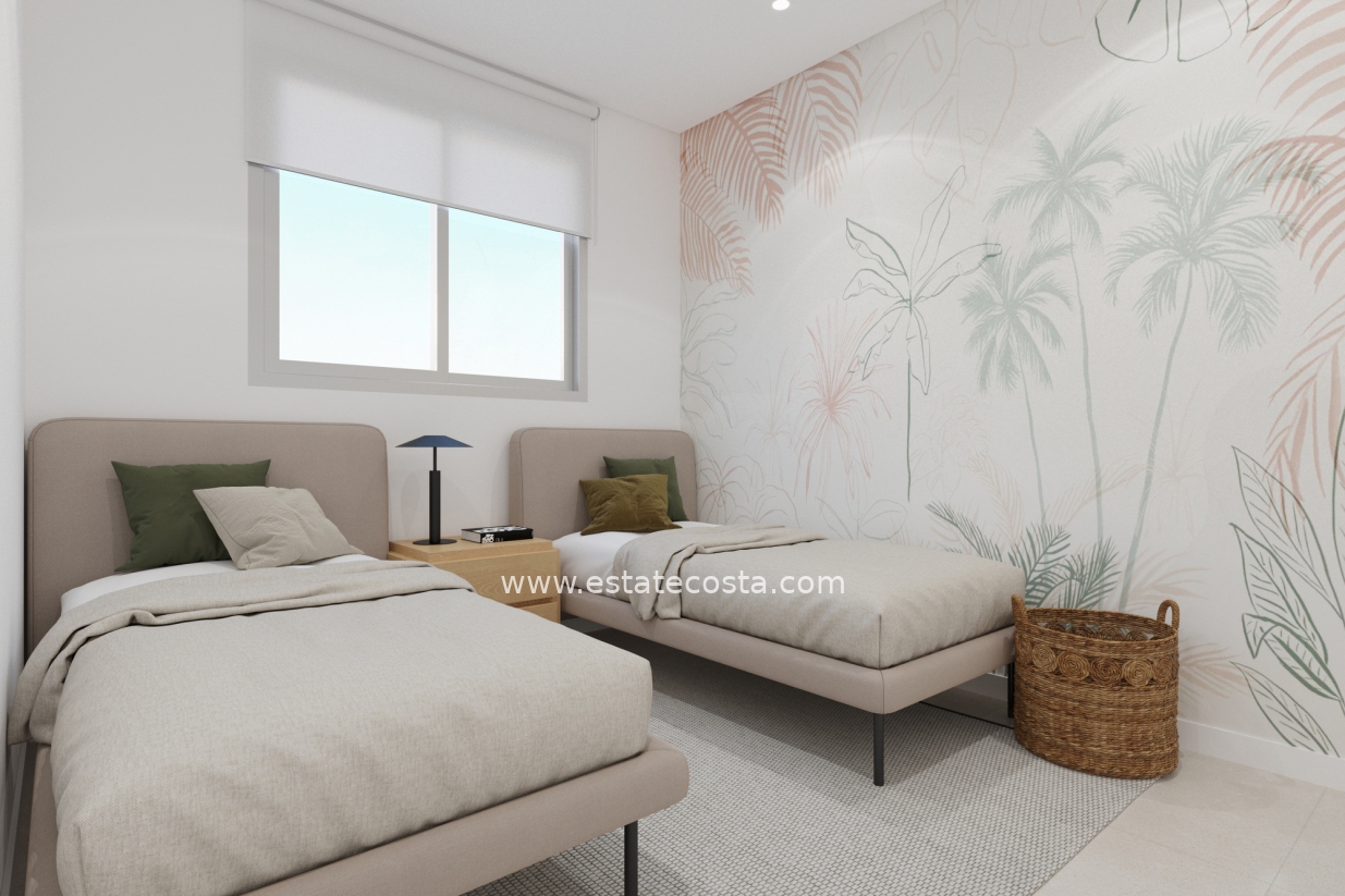 Nowoczesny, zamknięty kompleks składający się z 3 bloków apartamentów blisko plaży Santa Pola. Apartamenty mają 3 lub 2 sypialnie, oba typy obejmują 2 pełne łazienki, kuchnię na otwartym planie z salonem, wyposażone szafy, taras oraz miejsce parkingowe. Kompleks z dużymi terenami wspólnymi z palmami i roślinnością, oraz basenem, placem zabaw dla dzieci i parkingiem dla rowerów. Basen z wejściem typu plażowego, wyposażony w prysznice i dużą drewnianą pergolę. W centralnej części basenu znajduje się płytszy obszar, w którym znajdują się łóżka wodne. Santa Pola znajduje się na popularnym wybrzeżu Costa Blanca nad Morzem Śródziemnym, na południe od Alicante, w otoczeniu naturalnych krajobrazów i ze specjalnym mikroklimatem, który oferuje łagodny klimat przez cały rok. Jej centrum jest ograniczone od wschodu i zachodu fortecą zamkową i portem, a graniczy z Parkiem Naturalnym Santa Pola Salinas oraz Sierra i Cabo de Santa Pola. Znajduje się 21 km od Alicante i 15 km od międzynarodowego lotniska "Elche-Alicante"