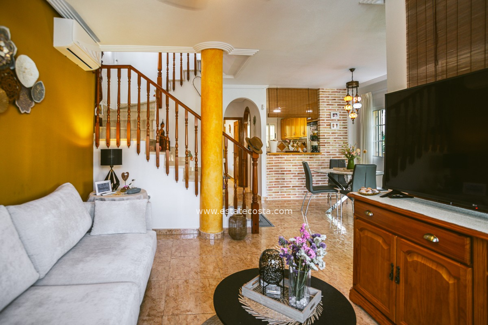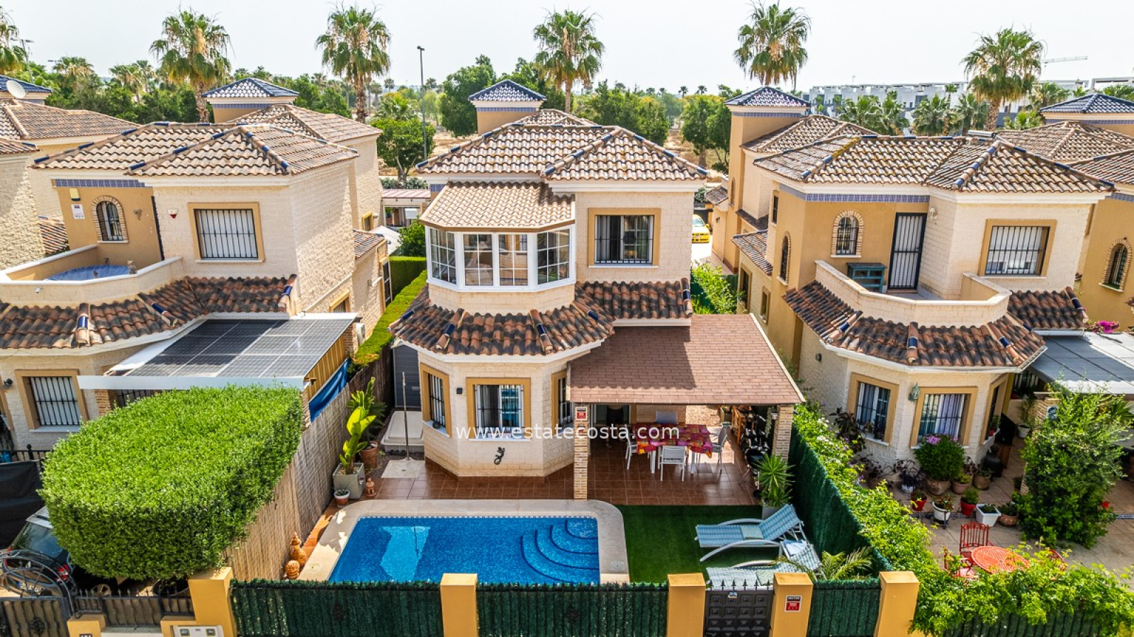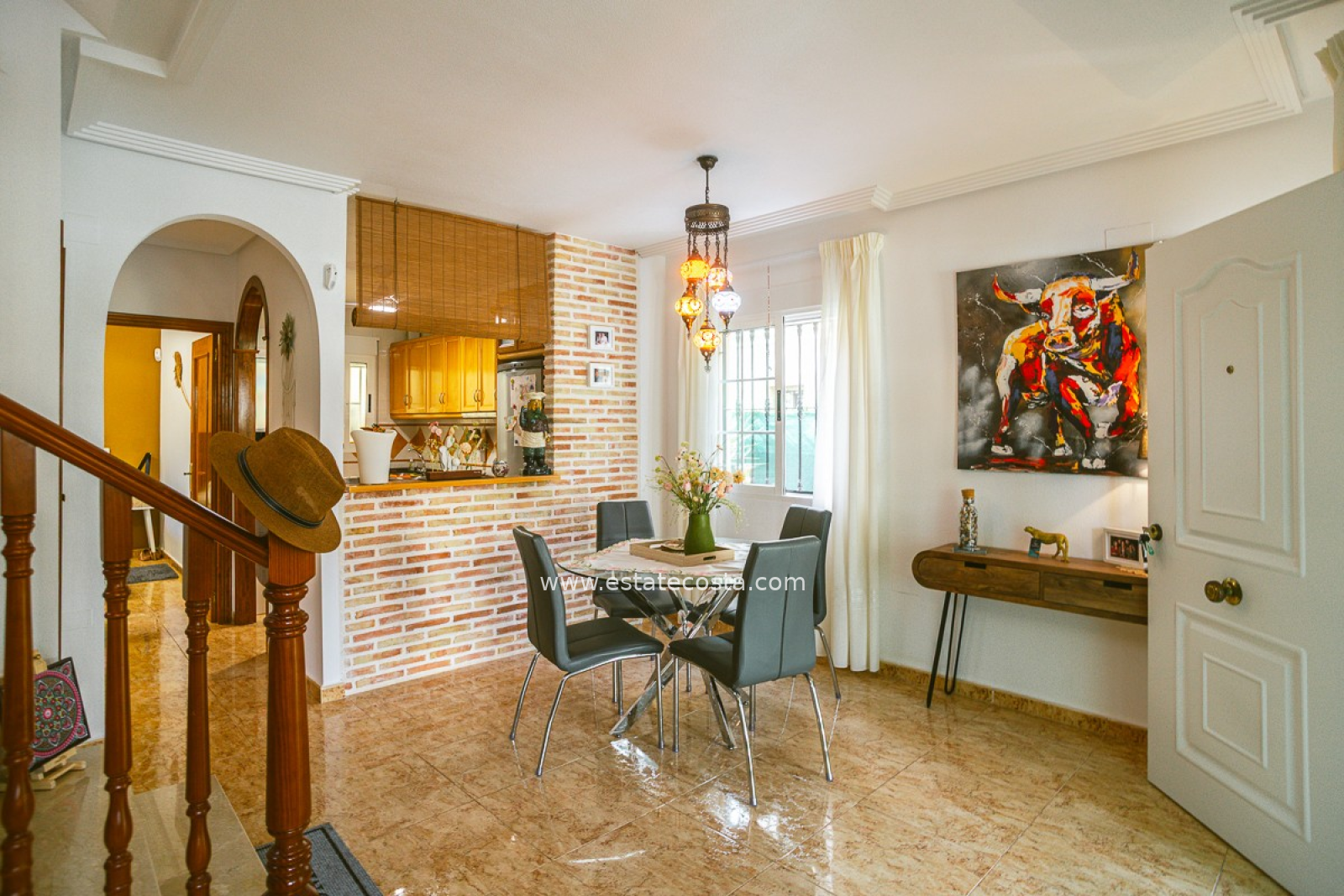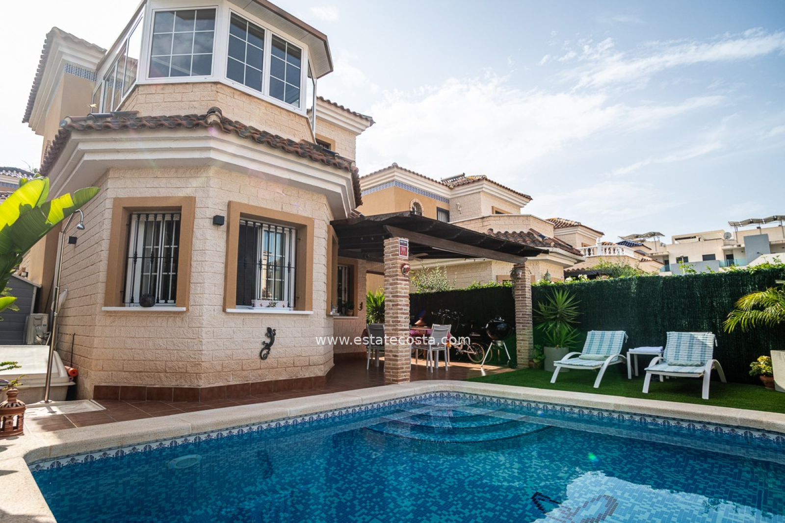 Z przyjemnością prezentujemy tę stylową śródziemnomorską willę, położoną w popularnej dzielnicy mieszkalnej El Raso w Guardamar del Segura. Nieruchomość położona jest na działce o powierzchni 188 m² i ma powierzchnię mieszkalną 88 m², rozłożoną na dwóch piętrach. Dzięki południowo-wschodniej orientacji będziesz cieszyć się dużą ilością naturalnego światła i przyjemną atmosferą przez cały rok. Willa oferuje elastyczny układ i nadaje się jako stały dom, dom wakacyjny lub wynajem wakacyjny. Na parterze znajdziesz przestronny otwarty salon z nowoczesną kuchnią, jadalnią i częścią wypoczynkową, a także sypialnię dwuosobową i pełną łazienkę. Na pierwszym piętrze znajdują się dwie kolejne sypialnie, druga łazienka i dostęp do prywatnego solarium, idealnego do relaksu na słońcu. Na zewnątrz nieruchomość ma dwa tarasy i prywatny basen o wymiarach 5x4 metrów.