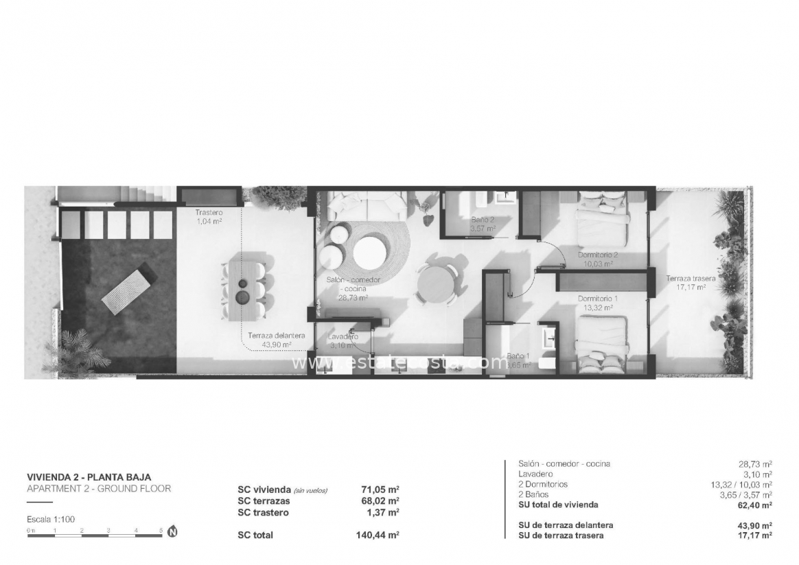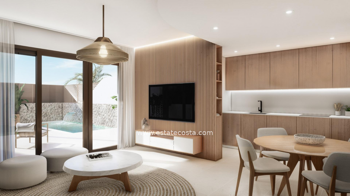 Nowoczesne bungalowy z 2 sypialniami, 2 łazienkami, kuchnią na otwartym planie z salonem i tarasem. Bungalow na najwyższym piętrze ma prywatne solarium. Wszystkie bungalowy mają miejsce parkingowe. Na terenie obiektu znajduje się wspólny ogród z basenem. Uprzywilejowana lokalizacja San Pedro del Pinatar na wybrzeżu Mar Menor i Morza Śródziemnego przyciąga osoby zainteresowane żeglarstwem i sportami wodnymi, podczas gdy plaże i naturalne kąpiele błotne przyciągają tych, którzy szukają słońca, morza i piasku. Ponadto ma doskonałą lokalizację, zaledwie 5 minut od centrum handlowego Dos Mares. Lotnisko Murcia/Corvera oddalone jest o 30 minut, a lotnisko Alicante o godzinę jazdy samochodem.