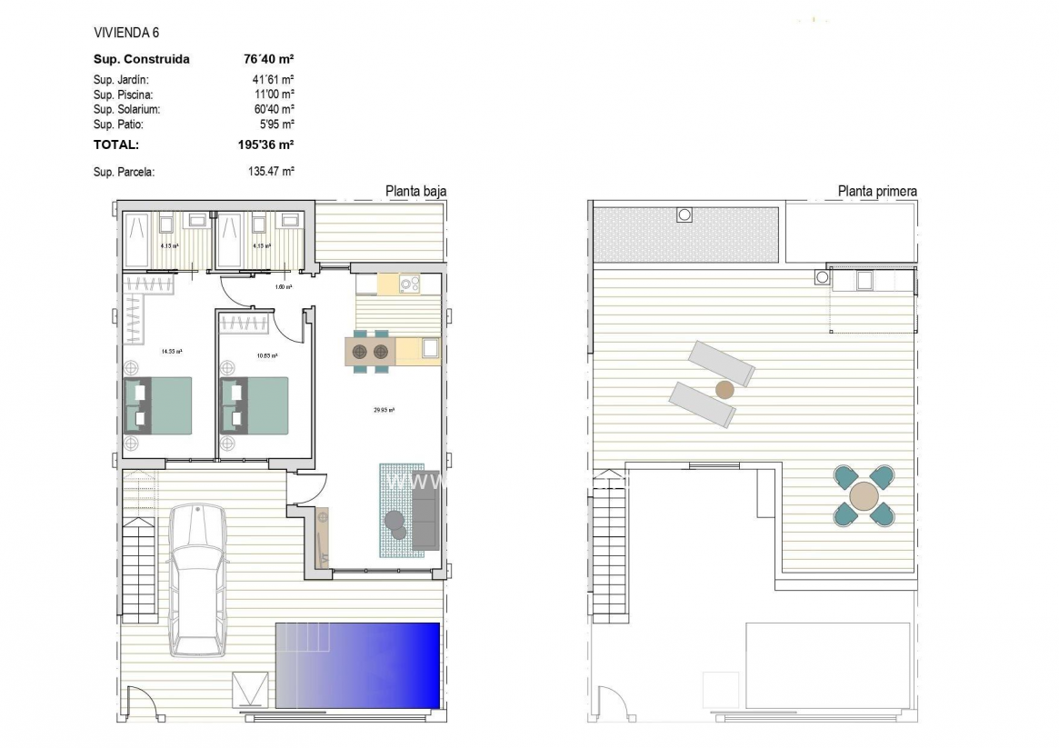 Nowoczesne domy typu bliźniak z 2 sypialniami i 2 łazienkami, kuchnią na otwartym planie z salonem oraz tarasem. Ponadto nieruchomości posiadają prywatne solarium, ogród z basenem i miejsce parkingowe. Te ekskluzywne domy zostały zaprojektowane z eleganckimi i funkcjonalnymi wnętrzami, w pełni wyposażonymi kuchniami. W sypialniach natomiast znajdują się szafy z szufladami, a każda nieruchomość ma wstępną instalację klimatyzacji kanałowej. Położony obok Club de Golf, Torre Pacheco, gdzie znajdują się wszystkie udogodnienia, w tym bary, restauracje, supermarkety i banki oraz 15 minut jazdy samochodem do pięknych plaż Mar Menor. Pobliska sieć autostrad umożliwia szybkie i łatwe podróżowanie do innych obszarów, a międzynarodowe lotnisko w Murcji oddalone jest o 20 minut.