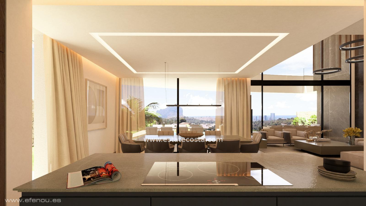 Willa oferuje 335 m² luksusowej przestrzeni mieszkalnej na dużej działce o powierzchni 1 042 m², ze spektakularnymi widokami na morze, Peñón de Ifach i miasto Calpe. Dzięki trzem starannie zaprojektowanym piętrom połączonym wewnętrznymi schodami i windą, ta willa zapewnia styl i wygodę na każdym poziomie. Poziom półpiwnicy obejmuje parking, pralnię i piwniczkę na wino. Na głównym piętrze, do którego można dostać się schodami lub windą, znajduje się przestronny salon i jadalnia prowadzące na werandę i imponujący taras przy basenie. Otwarta kuchnia, w pełni wyposażona w urządzenia Siemens, płynnie łączy się z częścią dzienną. Na tym piętrze znajdują się również dwie sypialnie z łazienkami i toaleta dla gości. Na najwyższym piętrze znajdują się dwie dodatkowe dwuosobowe sypialnie, każda z łazienką i dostępem do otwartych tarasów z panoramicznym widokiem. Willa oferuje nowoczesne udogodnienia w tym oświetlenie LED, ogrzewanie podłogowe, klimatyzację kanałową oraz system aerotermalny do ciepłej wody i ogrzewania. Dodatkowe udogodnienia obejmują elektryczne żaluzje, wbudowane szafy, wewnętrzne i zewnętrzne systemy alarmowe, wstępnie zainstalowane kamery bezpieczeństwa oraz basen bez krawędzi o wymiarach 10x3,3 m z miejscem do grillowania.