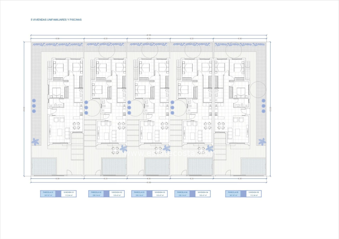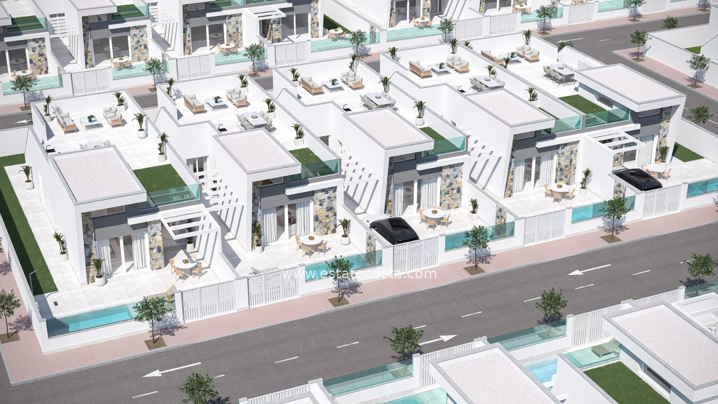 Odkryj to ekskluzywne osiedle pięciu jednopiętrowych willi w uroczym miasteczku Los Alcázares.