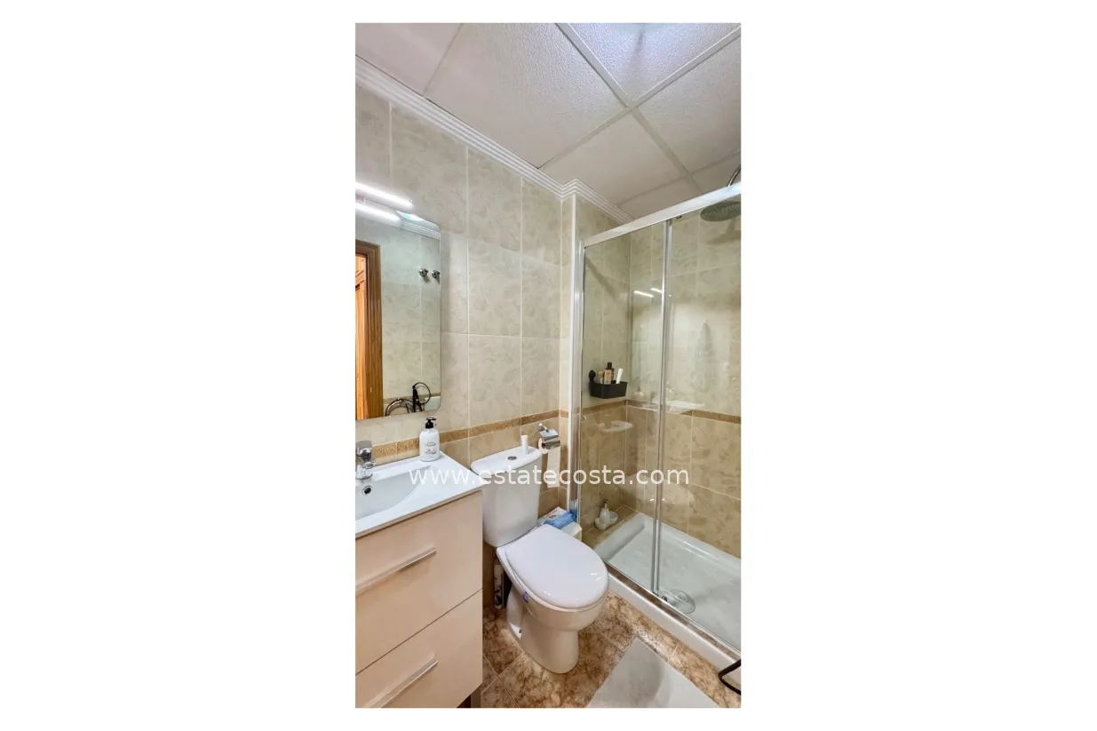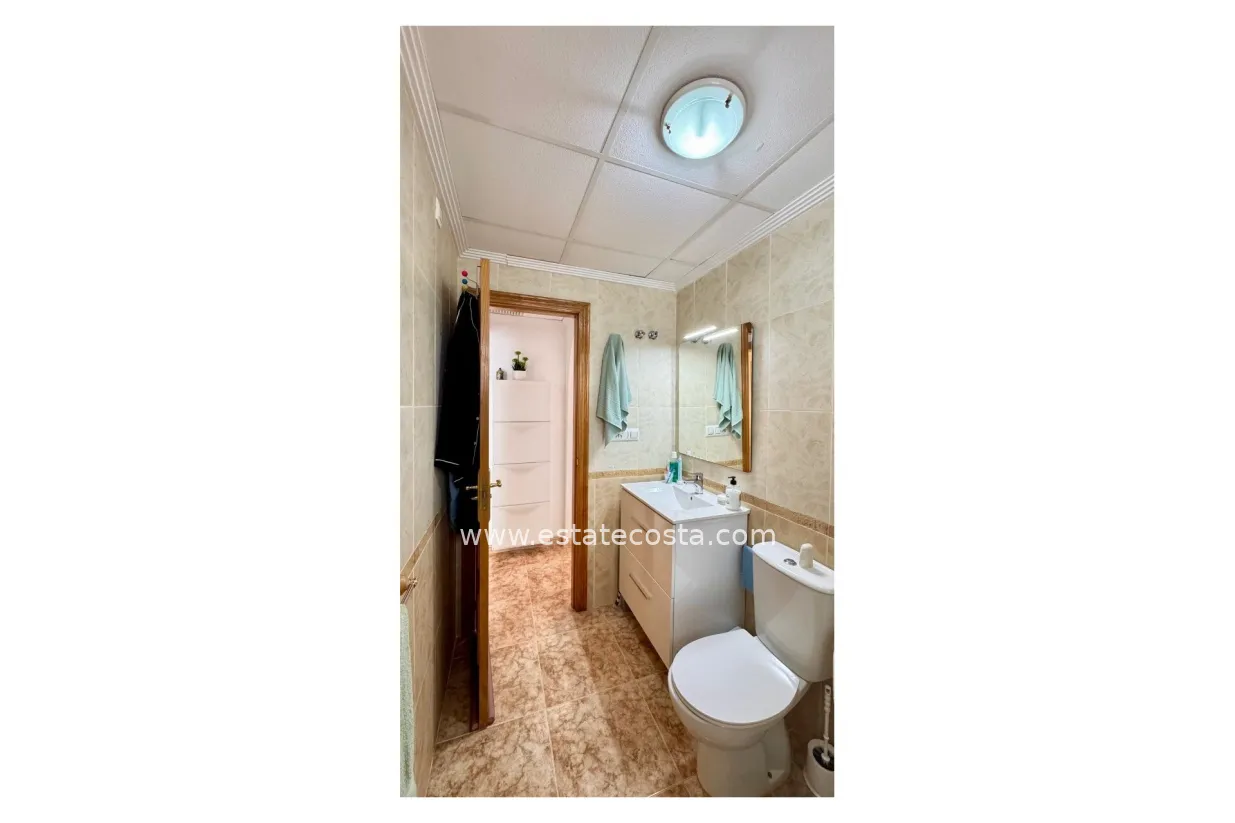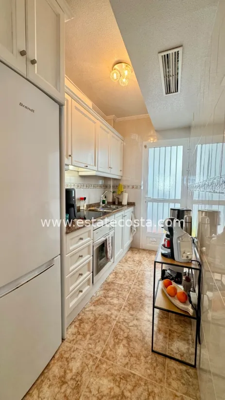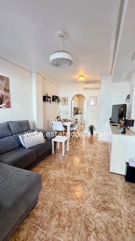 Nieruchomość oferuje dwie sypialnie i dwie łazienki, jasny salon z wyjściem na zadaszony taras oraz duży taras od strony północno-zachodniej. W pełni wyposażona kuchnia uzupełnia zadaszony taras z tyłu, na którym można wygodnie ustawić pralkę i podgrzewacz wody. Bungalow jest również wyposażony w klimatyzację z funkcją ogrzewania i chłodzenia, zapewniającą optymalny komfort przez cały rok. Dodatkowo, do nieruchomości przynależy podziemne miejsce parkingowe i komórka, zapewniająca dodatkowe miejsce do przechowywania. Jego prawdziwym atutem jest doskonała lokalizacja między Punta Prima a Playa Flamenca, z wszystkimi udogodnieniami w zasięgu spaceru: sklepami, restauracjami i atrakcjami rekreacyjnymi. Morze znajduje się zaledwie 2 km od domu, co umożliwia łatwy dostęp do plaż bez konieczności korzystania z samochodu.