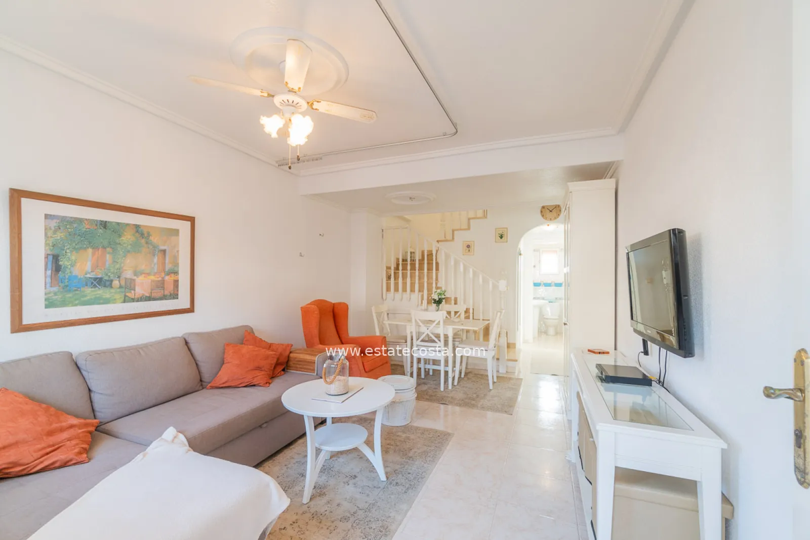 Dom szeregowy z widokiem na basen, zorientowany na południowy zachód. Nieruchomość posiada taras wejściowy, jasny i przestronny salon z jadalnią, niezależną kuchnię, w pełni umeblowaną i wyposażoną w sprzęt AGD, z której można wyjść na tylne patio z miejscem do grillowania i schowkiem. Na parterze znajduje się również toaleta dla gości. Na piętrze znajdują się dwie przestronne sypialnie z wbudowanymi szafami, a także niedawno odnowiona główna łazienka z kabiną prysznicową. Na dachu znajdują się dwa solaria: jeden z widokiem na wspólny basen i ogród, a drugi z tyłu z widokiem na morze.